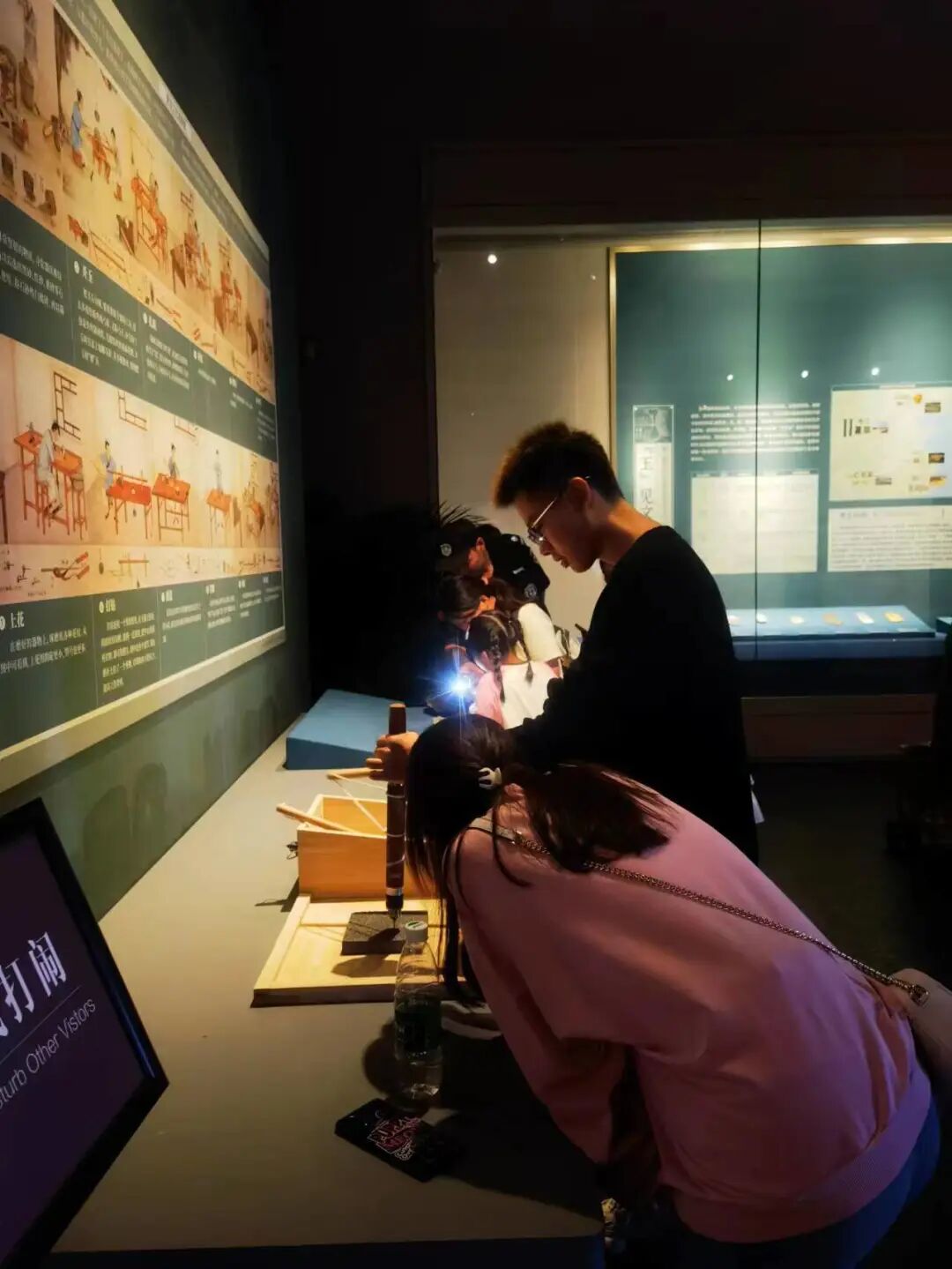 制玉体验台:《诗经》中写“如切如磋,如琢如磨”,一块不规则的玉成为温润的玉器,需要通过切割、磨制、钻孔、打磨、抛光等诸多工艺。制玉体验台依托古代制玉工艺,让观众体验到制玉过程中打钻与打眼两个步骤。
