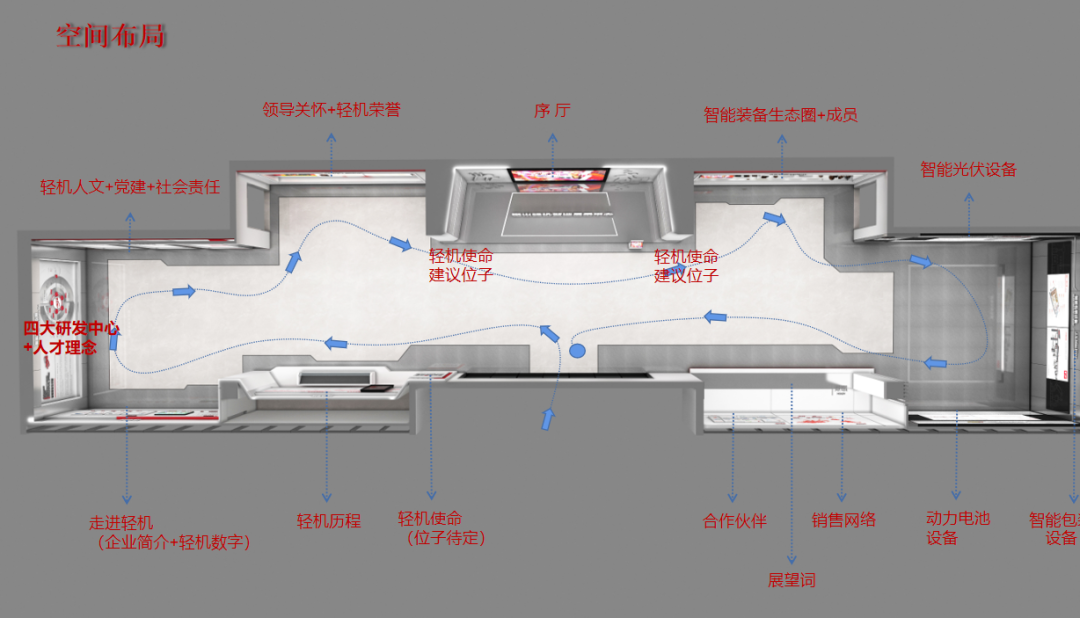 布局以流线型为核心,打造一种清晰、直观且高效的参观体验。通过精心规划参观路径,确保观众能够顺畅地从一个展区过渡到另一个展区,同时充分展示企业的核心产品和技术。这种布局不仅使展厅空间得到充分利用,还通过视觉引导和空间导向,帮助观众快速了解企业的整体实力和品牌形象。