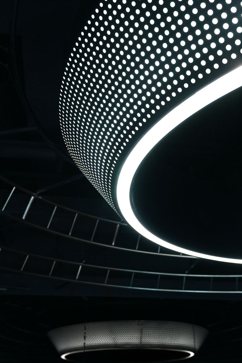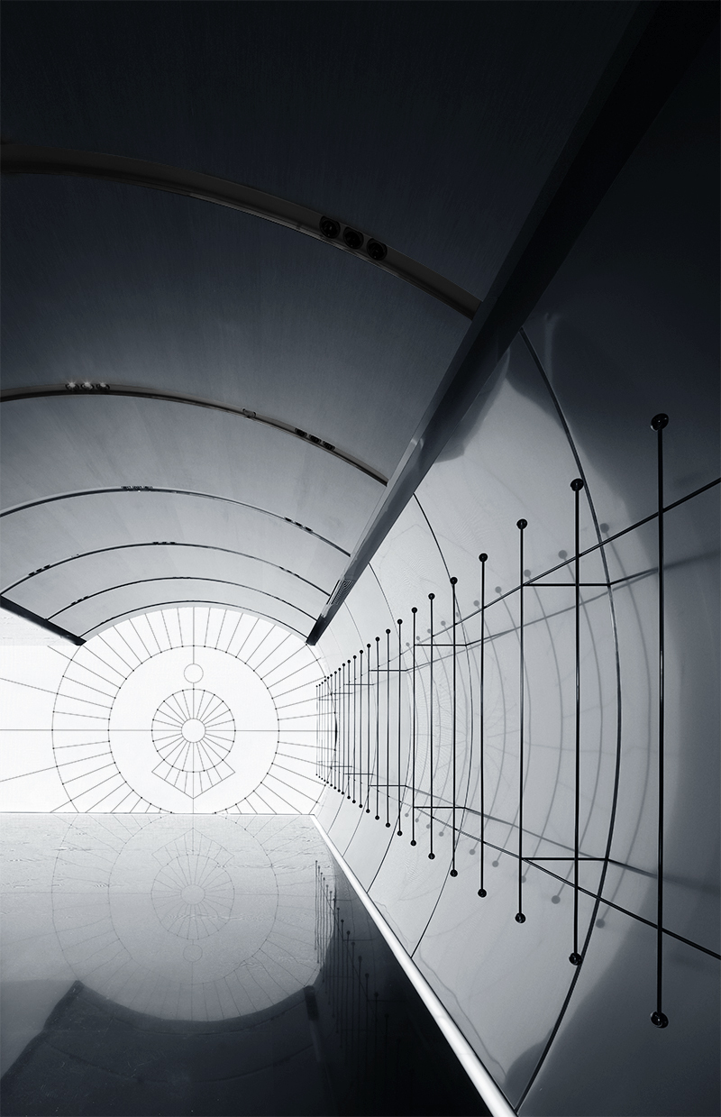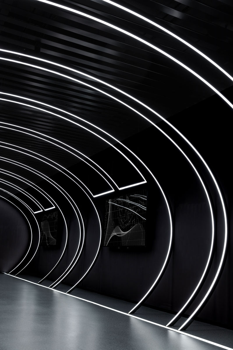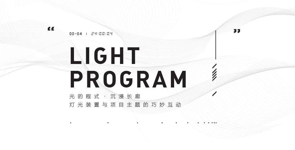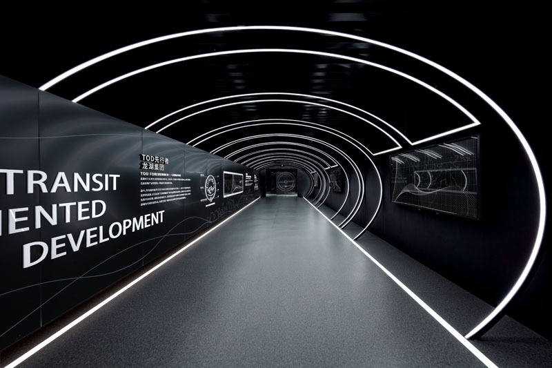 Junjia Design draws creative inspiration from the galloping streamline of high-speed trains and expresses it through the "program of light ". The lighting installation changes and flows forward with the program, like a comet streaking across the night sky, merging into an unknown distance, bringing visitors an emotional experience of trying to explore in the quiet and black background. Like walking through a time tunnel, it symbolizes the unknown experience that is about to enter the project, which greatly stimulates the imagination of visitors.