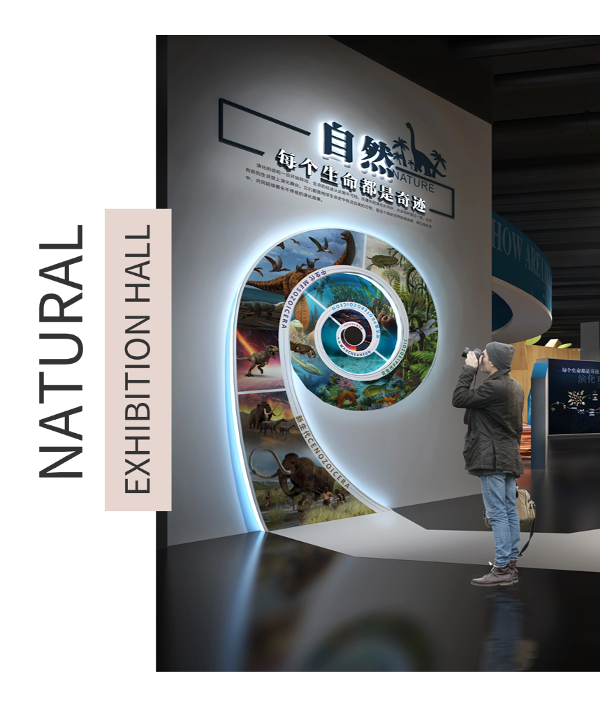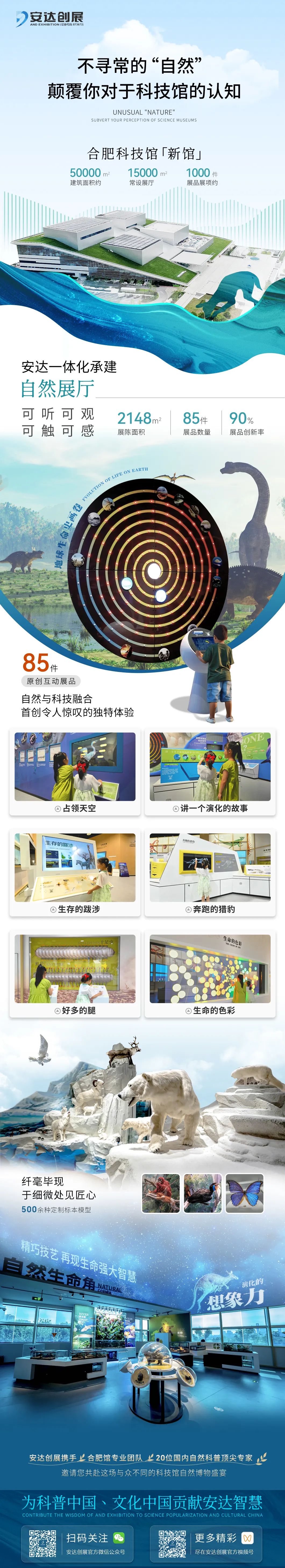 合肥科技馆新馆·自然展厅面积2148㎡,围绕“每个生命都是奇迹”的主题,打造 失落的世界、缤纷自然、适应奇技、和谐共生 四大分展区。 在展馆设计和搭建过程中,安达创展通过 选择环保材料、优化能源利用、应用现代技术 减少环境影响 , 将“绿色低碳”的理念融入到展厅的每一个细节中,打造全新的展览体验。