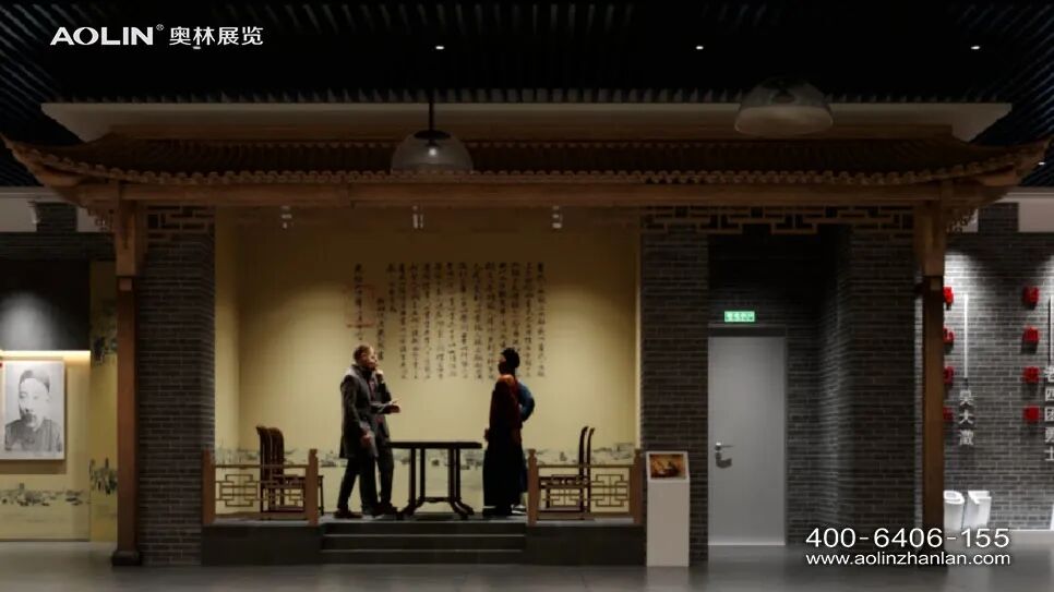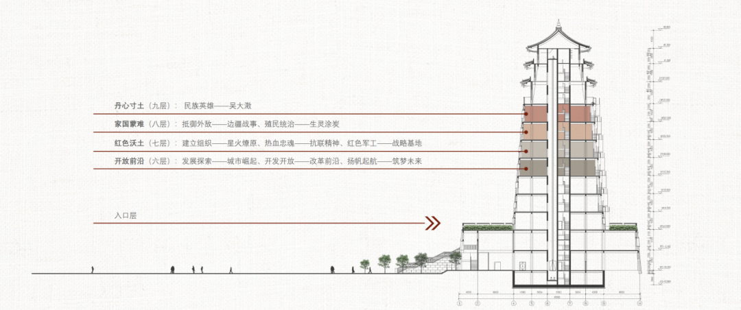 九层:吴大澂在与沙俄勘界时,以“一寸土地尽寸心”“应争者必争、应办者必办”的爱国情怀,争得重立“土字牌”、收回黑顶子地方、图们江口出海权三大功绩,捍卫了国家权益和民族尊严。提取明清时期古代建筑符号,凸显吴大澂英雄形象,不仅说明了故事发生的时代背景,同时给观者身临其境之感。