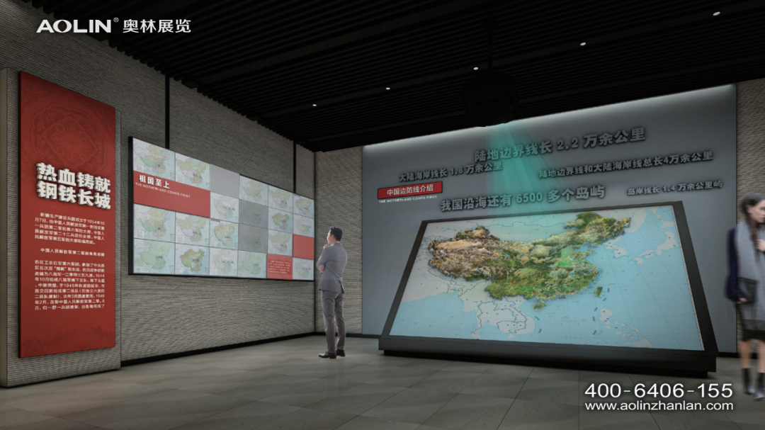 在展厅中,运用3D打印虚拟沙盘技术,结合投影影像相结合,高度还原了中国边防疆域与历朝历代的版图,让观者真实切身感受到祖国大好河山和许许多多可歌可泣、保卫边疆、寸土不让的动人事迹。