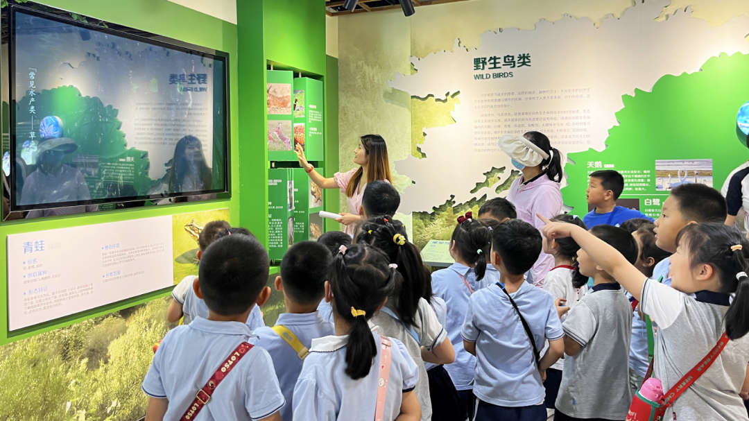 在水产类和昆虫类展示区,设置蝴蝶、蜻蜓标本及各类鸟类模型供大家参观,下方则设置了触摸屏可点选查询具体信息,为观展增添更多趣味。