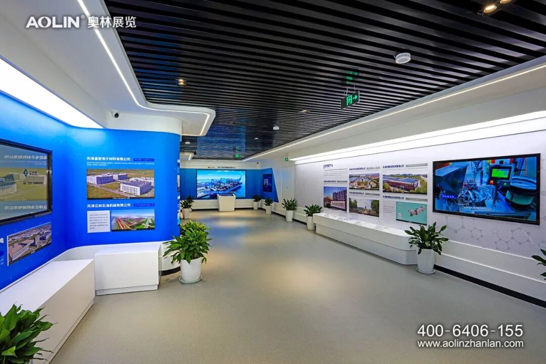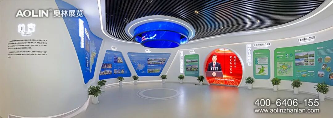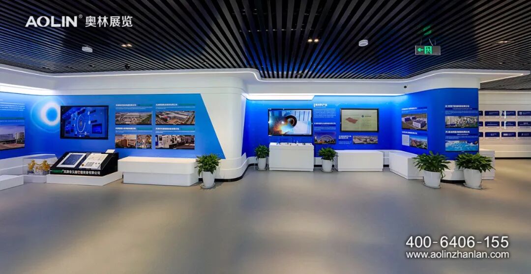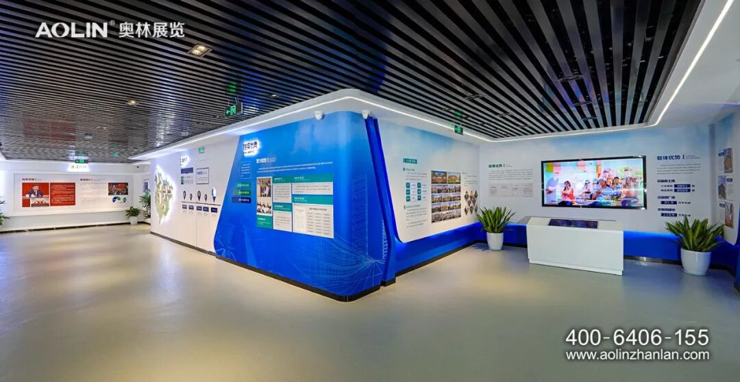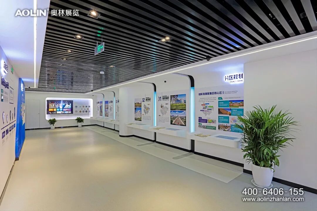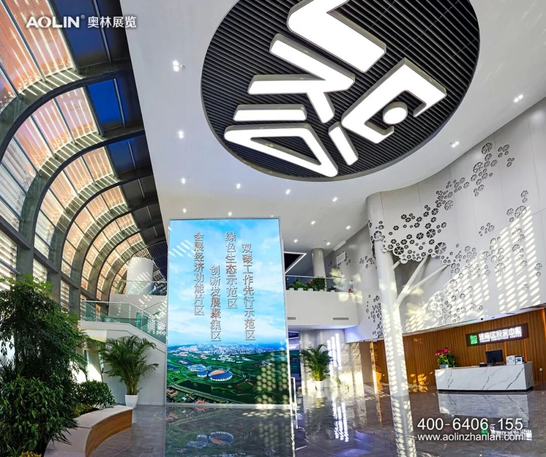 在设计理念上,奥林紧扣“绿色津南,智会天下”的展示主题进行布展设计。色彩使用上,展厅多以科技蓝、象牙白、高级灰为主色调,突出绿色生态与现代科技的结合。展厅以“智”源,“智”字理念贯穿整个展厅,在元素运用、空间造型、展面排版、展项设计上,处处体现智慧、智造、智能。同时,结合建筑特色和展厅需求,引入自然光和绿植景观,不仅具有视觉观赏性,也符合以人为本、节能环保、便于维护的综合效用。