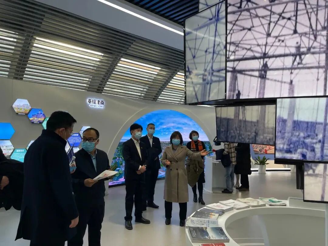 以“绿色津南,智会天下”为主题的津南区展示中心,分为区域概览篇、“双碳”工作先行示范区、绿色生态示范区、创新发展聚集区、会展经济功能区、幸福生活篇六个部分,是津南区招商引资平台、形象宣传名片、城市会客厅。