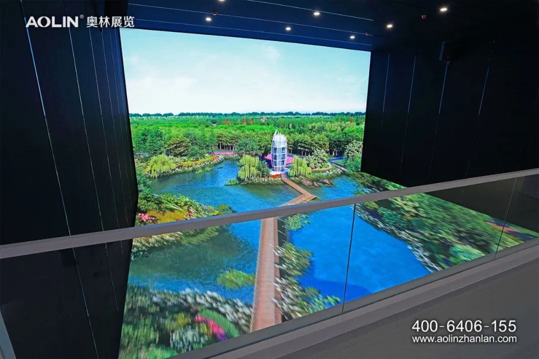 绿色生态屏障沉浸式体验空间,是在实景体验空间中,以高度的沉浸式虚拟现实系统,观众在具有科技感的沉浸式空间中主动参与互动体验,与之相配合的室内新风系统营造了清风徐来,微风拂面的轻柔之感,观众在舒适与愉悦中欣赏津南区一年四季变换的美丽景色,进一步感受津南区绿色生态屏障“大绿、大水、大花园,成林、成片、成景观”的生动景象,为观众观展带来了更多互动趣味性。
