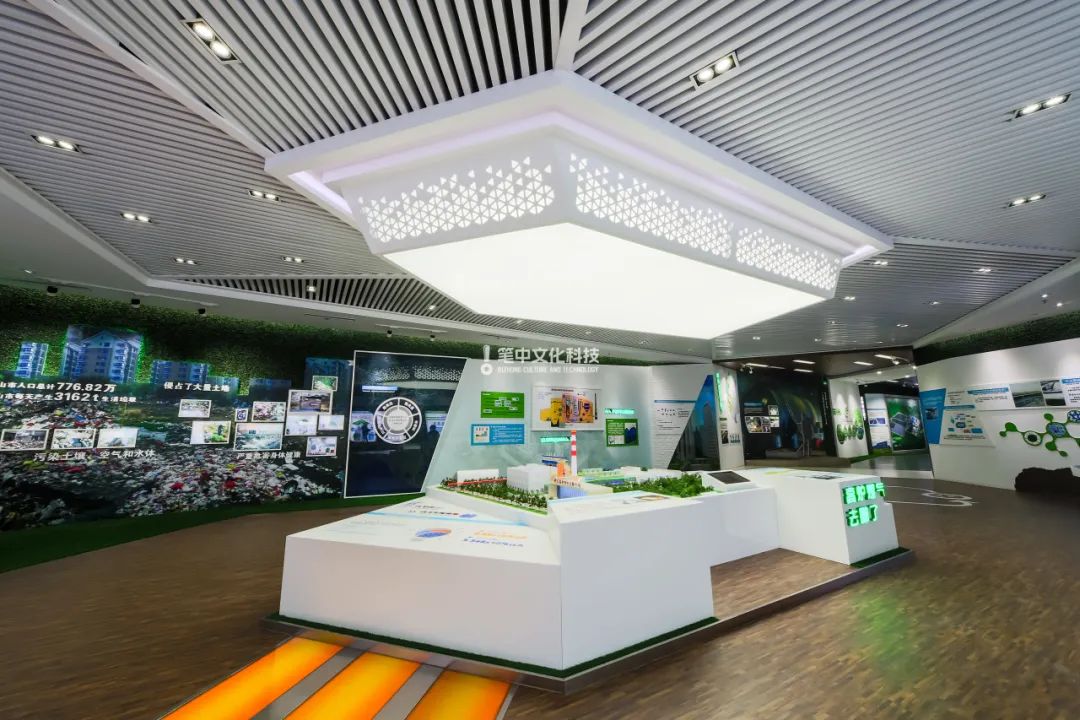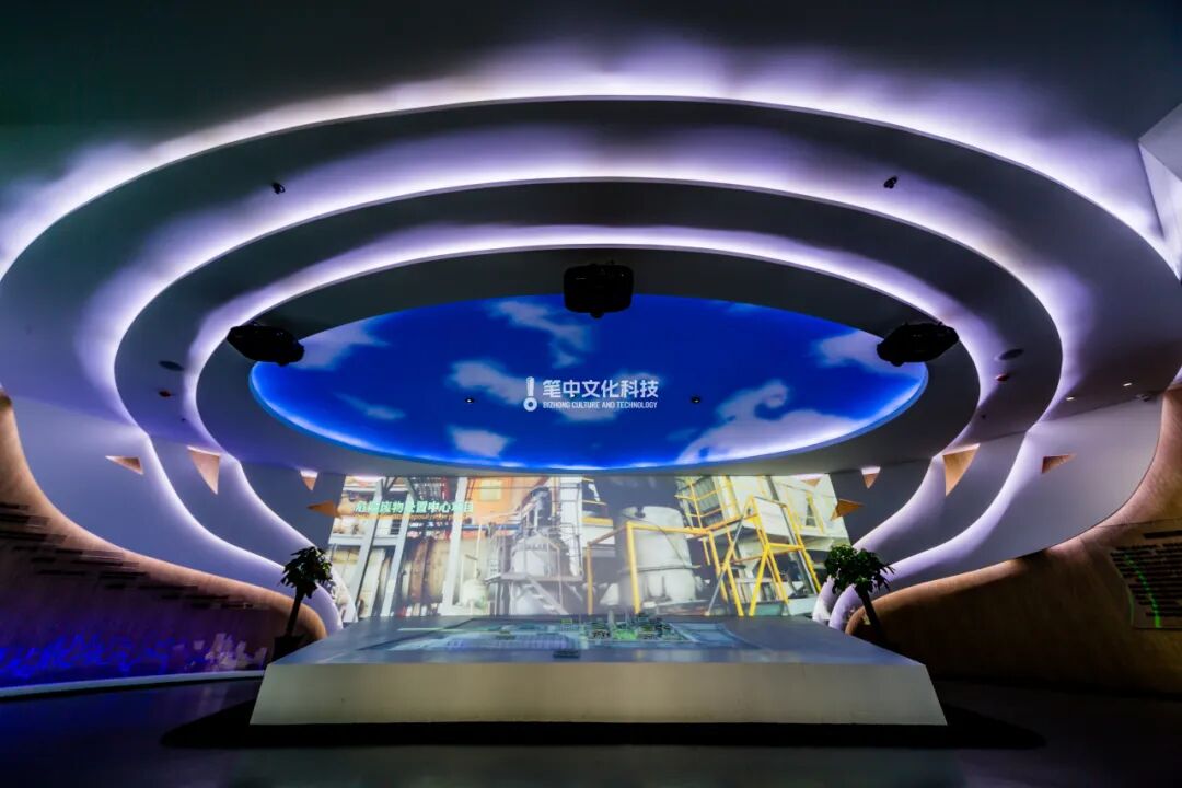 例如,笔中文化科技集团为鑫丰热力展厅设计的序厅,在序厅通过数字沙盘,展示生态园区的规划,并且设置交互式屏幕和虚拟现实设备,让观众通过触摸、手势等方式进行互动体验。