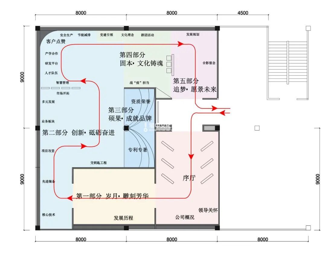 走过荣誉区域,现在我们来到中丽集团的软实力展区,空间形式上我们沿用空间大创意链接的元素,在顶部与地面贯穿使用。