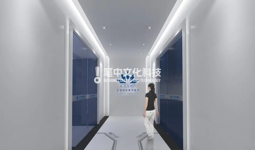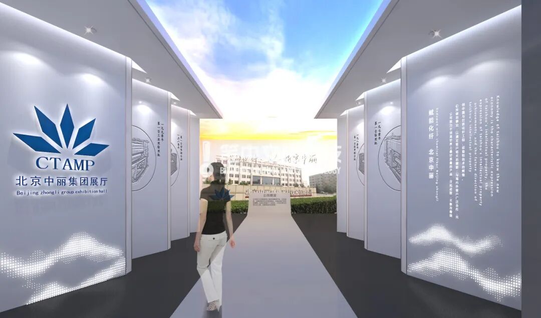参观者在进入展厅前,首先看到展厅入口形象墙,该区域通过北京中丽LOGO指引参观者来到展厅入口,左侧为展厅入口,右侧为展厅出口。