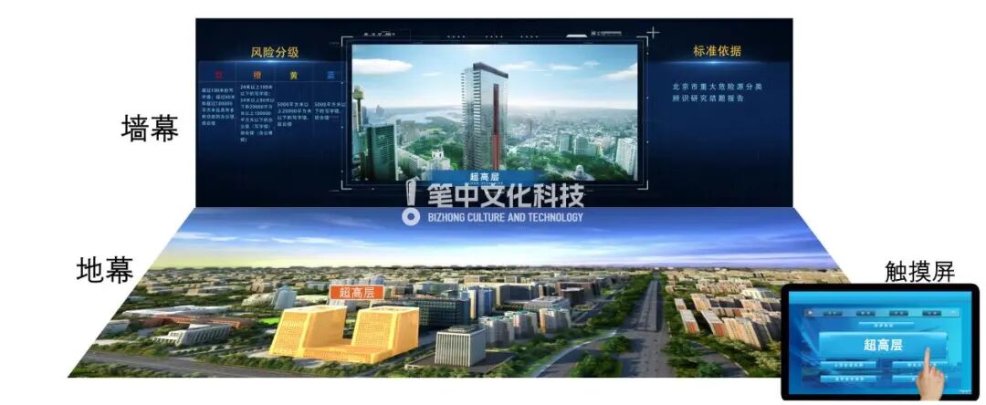 总体呈现出“5厅2室1走廊”的布局,即:高危行业厅、工业综合厅、城市风险厅、仓储综合厅、综合业态厅、配电室、危化品实验室、公共安全走廊。