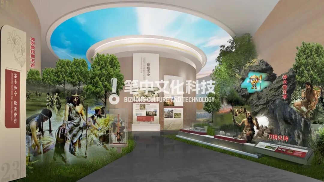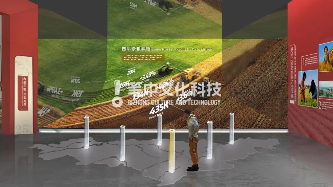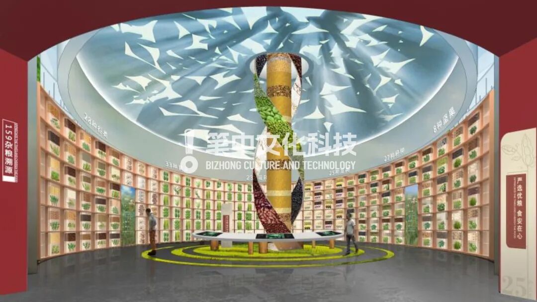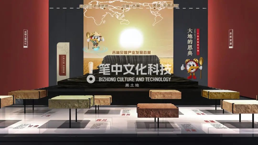 整馆顶部以蓝天白云 ,墙面背景选取六大类杂粮作物良田背景,地面为黑土。
