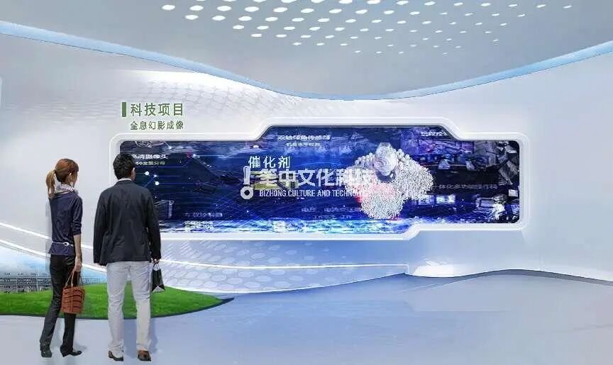 进入科技项目展区,通过180度全息幻影成像三维立体展示液5G矿山、催化剂等科技项目。