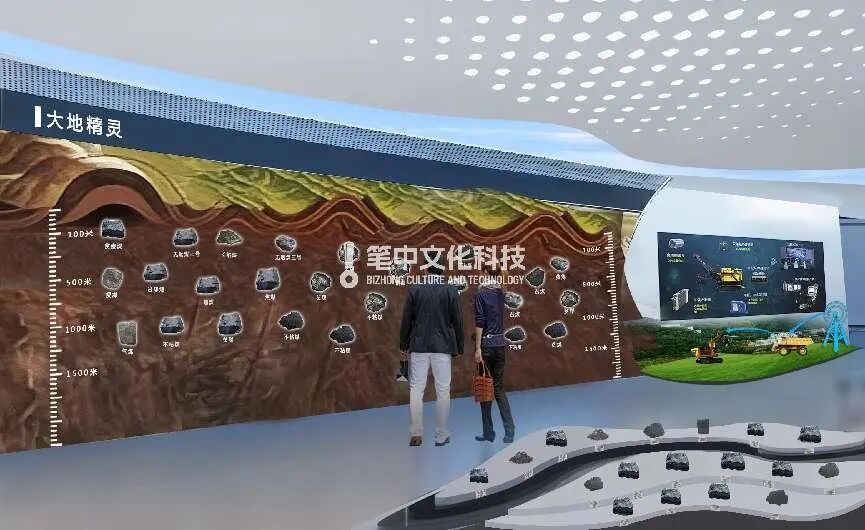 大地精灵内容重点展示煤炭产品,设计上采用地质剖面模型,把煤炭产品嵌入其中.可通过标尺了解各类煤炭埋藏的深度。