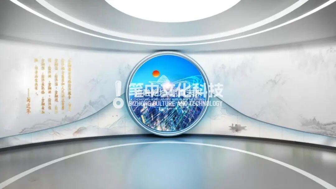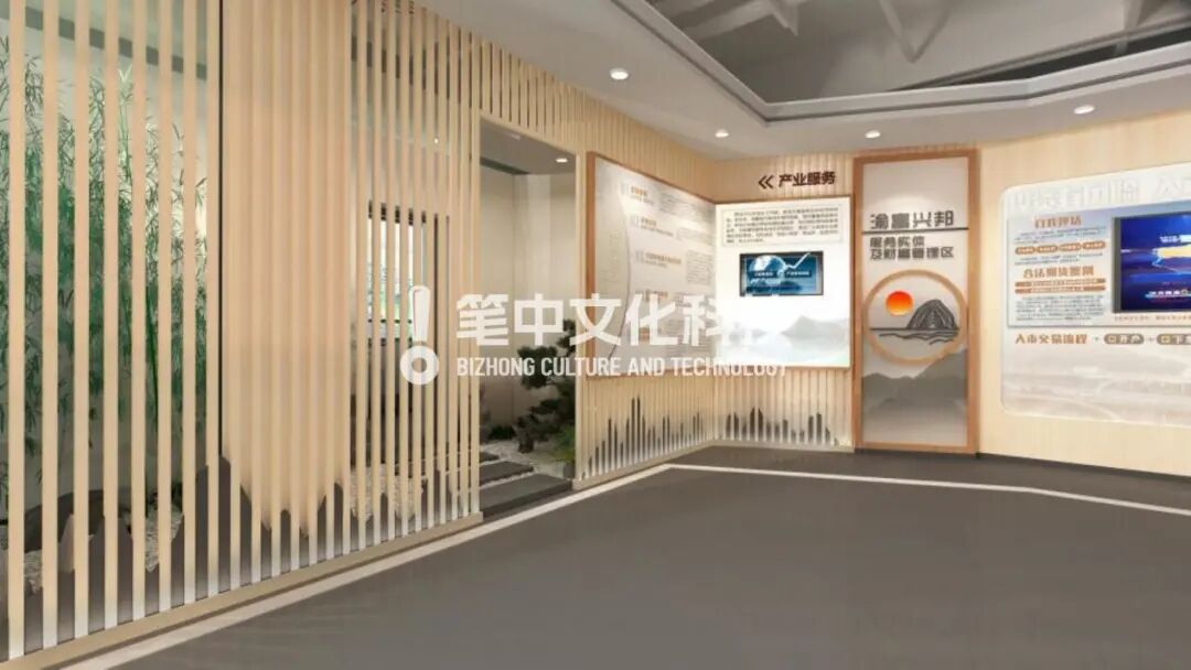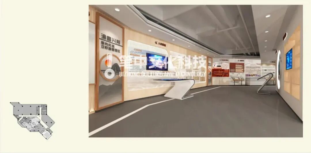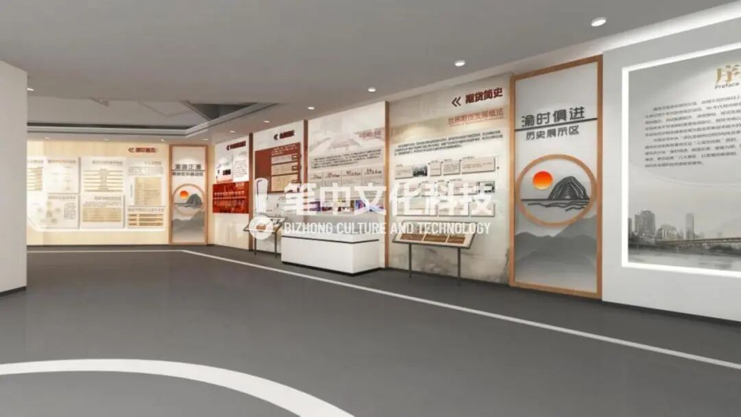 此展区以雅致的空间色彩结合重庆地域元素山水打造整体空间氛围,展墙采用古书籍的造型延续历史氛围, 并通过利用展墙前方空间 ,将其成为立式图文展架。