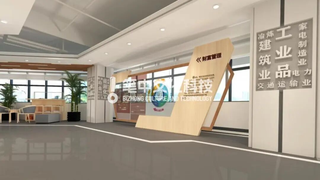 此区域我们将现有的两根柱子进行艺术再加工 ,利用柱体的3面把期货能服务哪些行业进行艺术大字的形式展示, 中间部分将财富管理区进行艺术造型墙设计 ,保证现场户外窗户的通透性, 将此部分内容呈现。