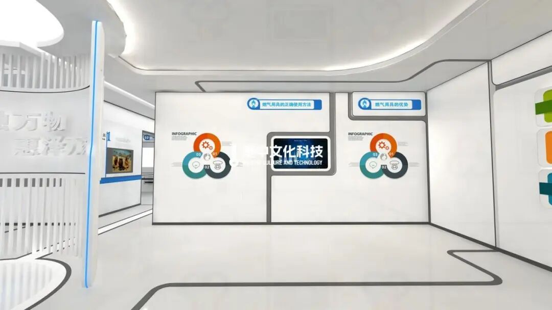 简洁的空间,重点突出内容展示,连接墙面、地面的线条抽象表现城市燃气管线。