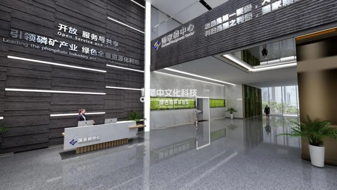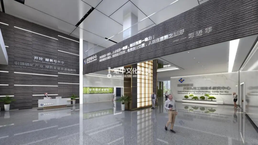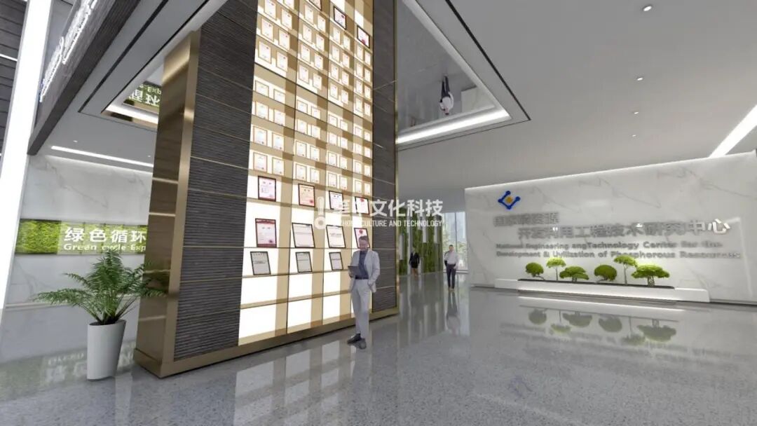 成果展示区域,国家磷中心的科研成果和国家级荣誉、资质、专利,通过发光亚克力展柜陈列展示。