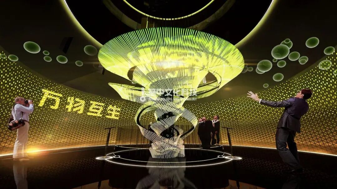 绿色循环体验馆以“万物互生”为主题开始展陈内容,序厅中央生命之体的装置中延续开来,它将是一条链接万物的生命之线,我们的故事也就是从这条线开始了。
