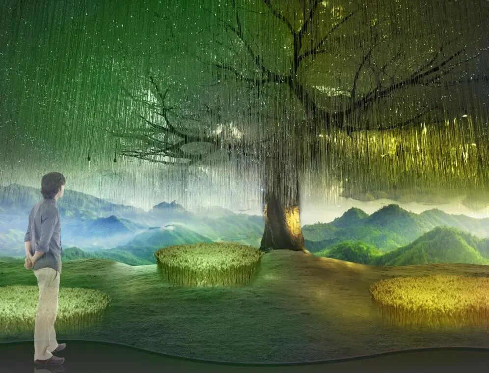 顶部的生命线搭配灯光效果变换色彩,营造生命要素为其创造的多样化的结果。
