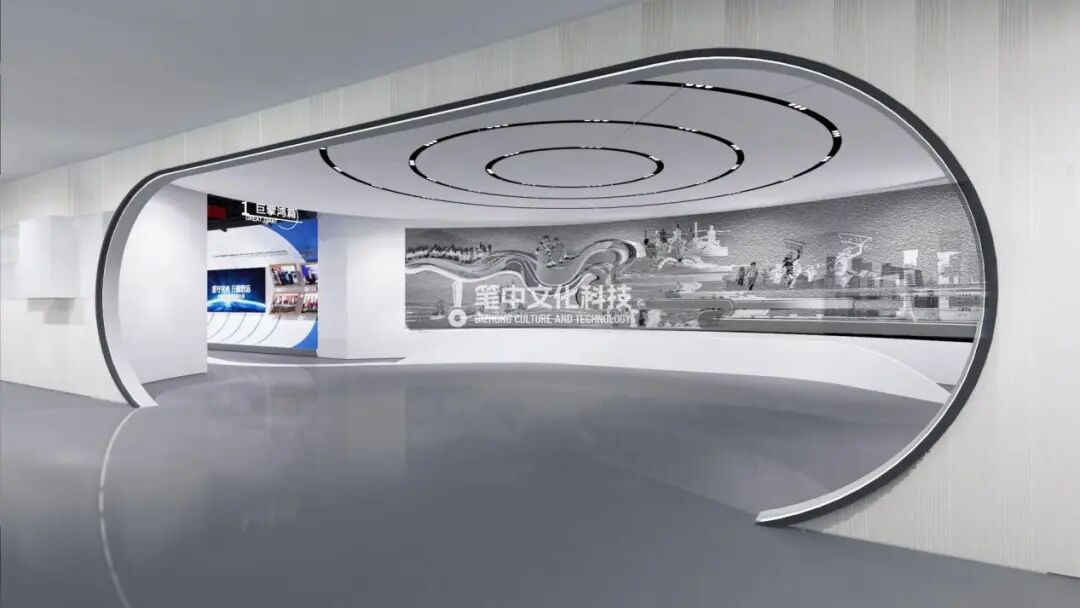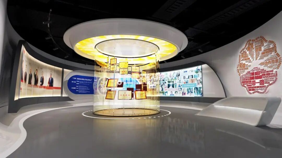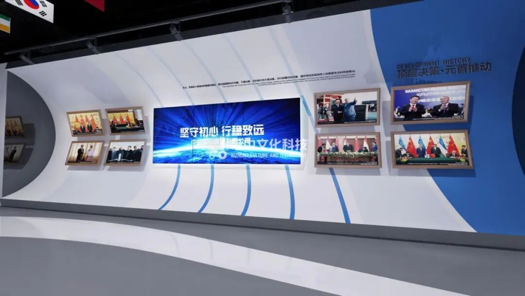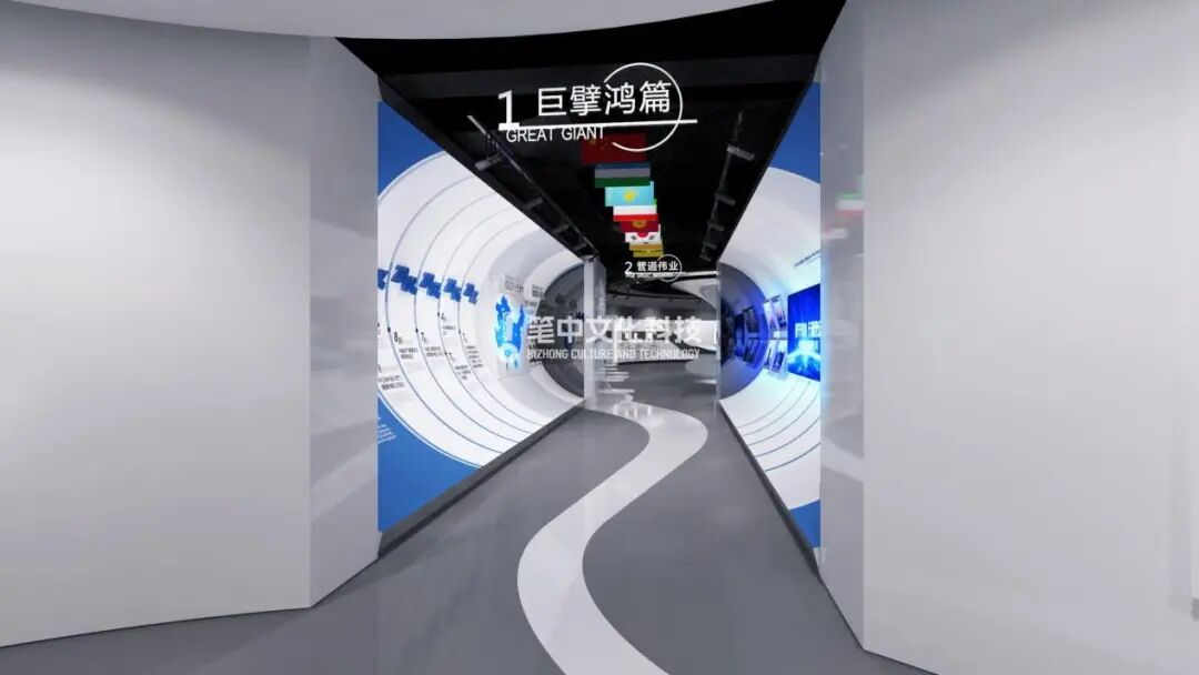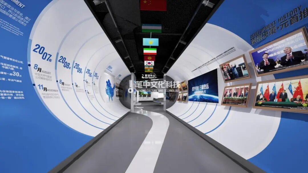以管道空间结构作为入口,展示企业的发展历程、大事记概述、以及顶层决策、元首推动发展等契机。