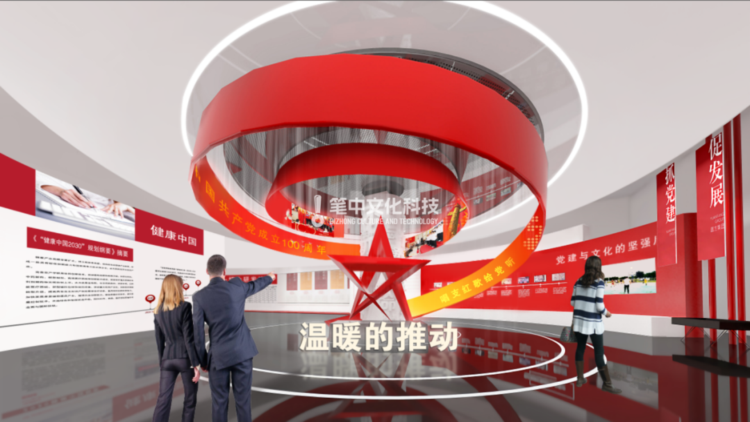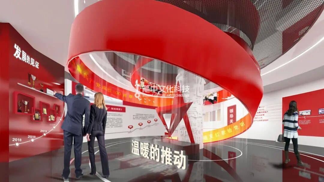 结合中心的艺术造型多媒体装置主要展示企业党的建设和企业文化的具体工作,并且展示员工风采,传递汇宇的精气神体现党建与文化的坚强后盾。