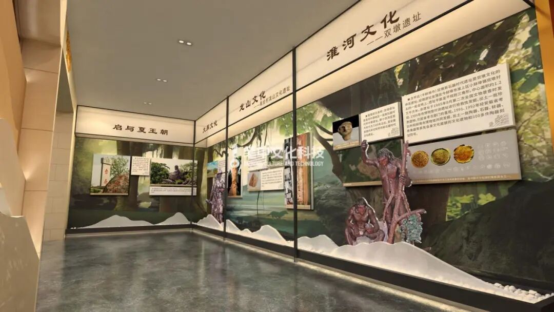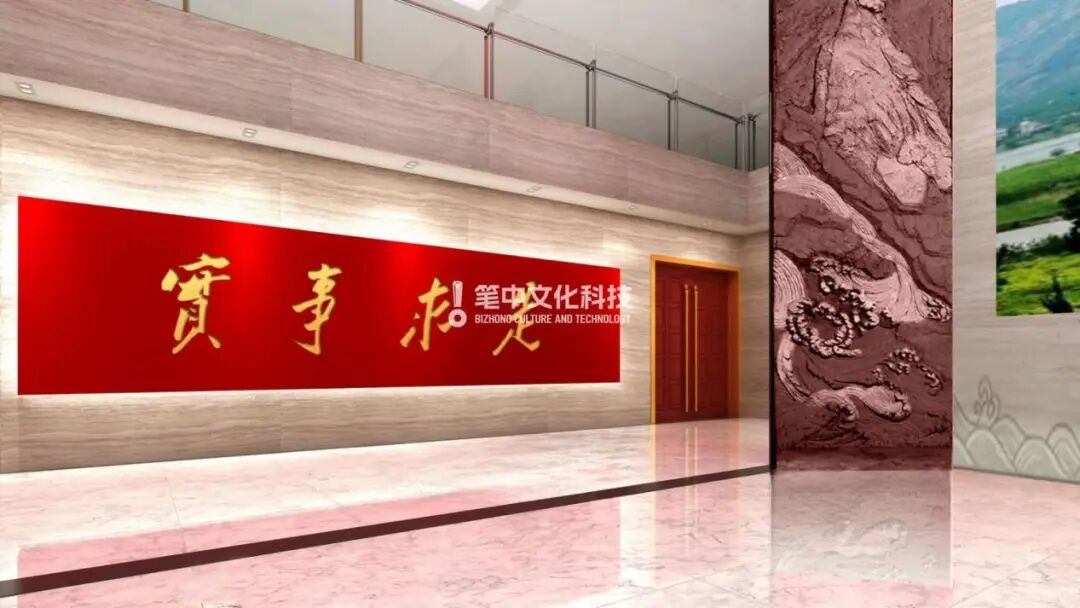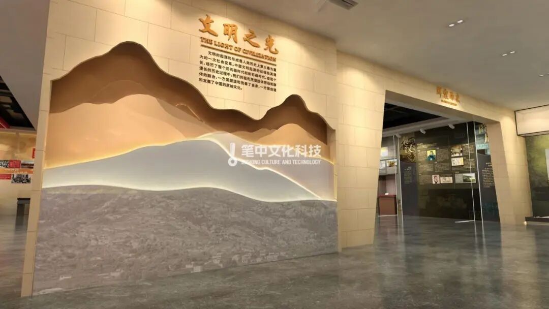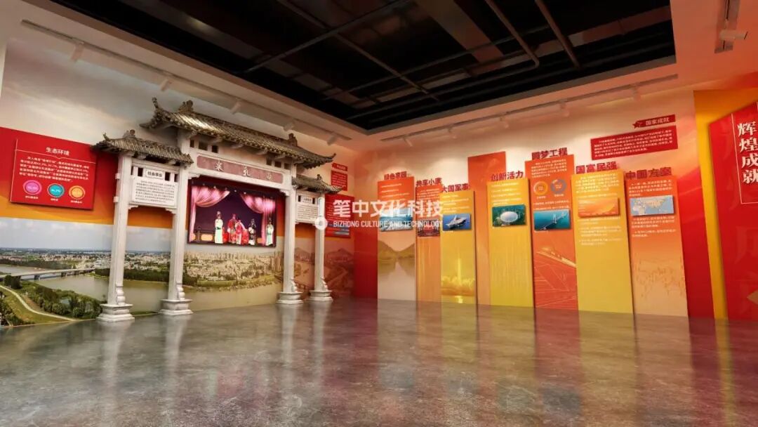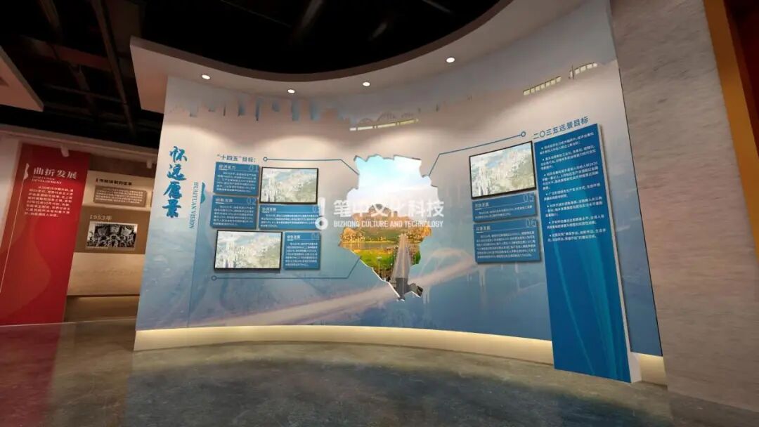 展厅各空间展项都结合了“历史长河”“大好河山”“中国共产党百年沧桑巍然屹立”的寓意特点,以“山”“水”为整体创意,各个部分分别根据不同内容融入党建、涡河淮河、怀远古建筑、石榴、花鼓灯等元素。