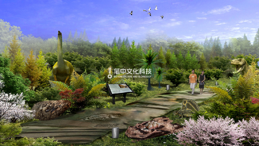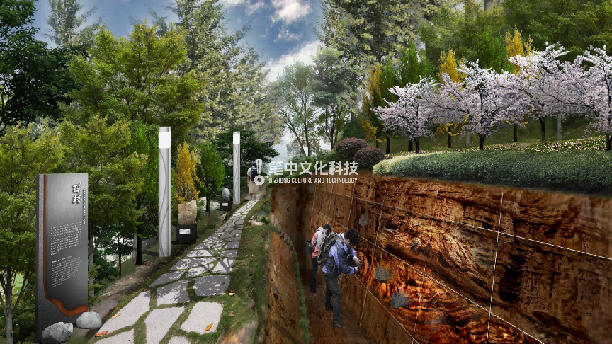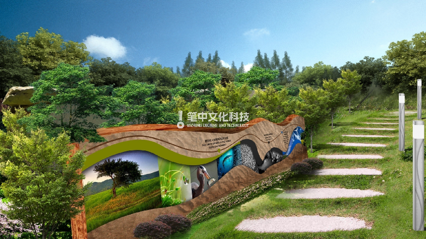 入口标志性艺术装置以地质沉积层和古生物演化为设计线索艺术化的设计处理形象展示出地球从更古至今的地质和生物的变化。