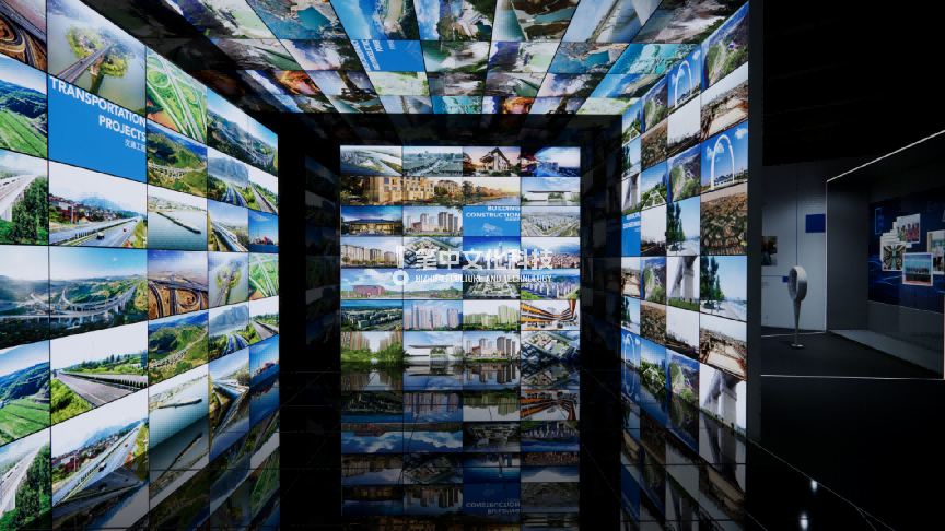 结合 RVR 蝶体成像技术实现序厅空间墙、顶、地的全媒体化,用独特的视觉语言葛洲坝建设公司的优质工程项目,全景互动展现项目技术亮点。