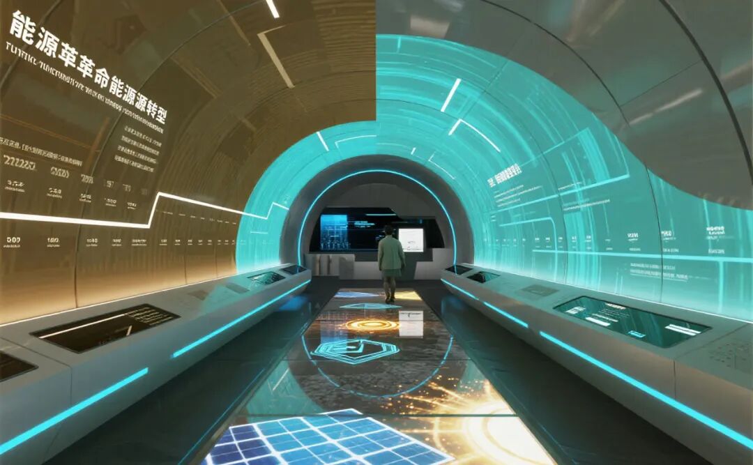 能源发展时间轴:双通道互动长廊铺陈能源进化史诗:左述煤炭、石油、天然气之变迁,右绘光伏、风电、氢能之崛起。压力感应玻璃地面,轻踏能源图标即触发全息解析,生动展现技术迭代。