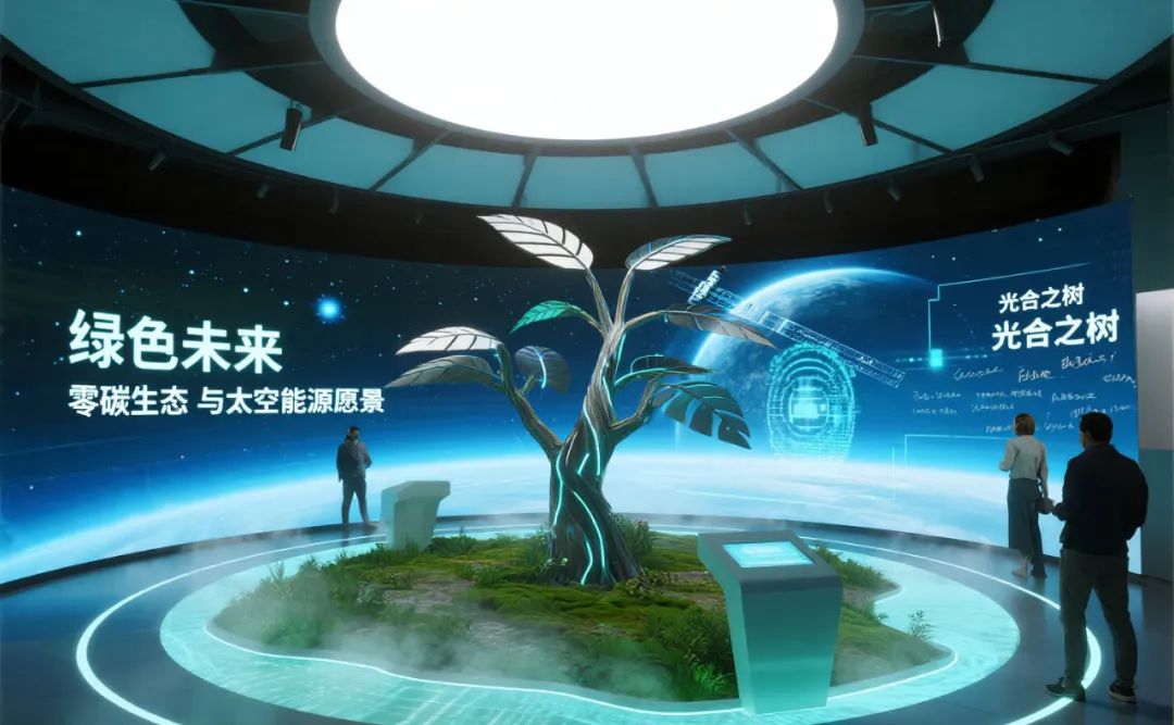 零碳未来剧场:升降式全景舞台演绎《零碳的一天》:全息氢能炼钢、环幕沙漠能源岛、激光矩阵太空光伏。剧终沉降舞台,真实能源植物破土而出,寓意生机勃勃的未来。