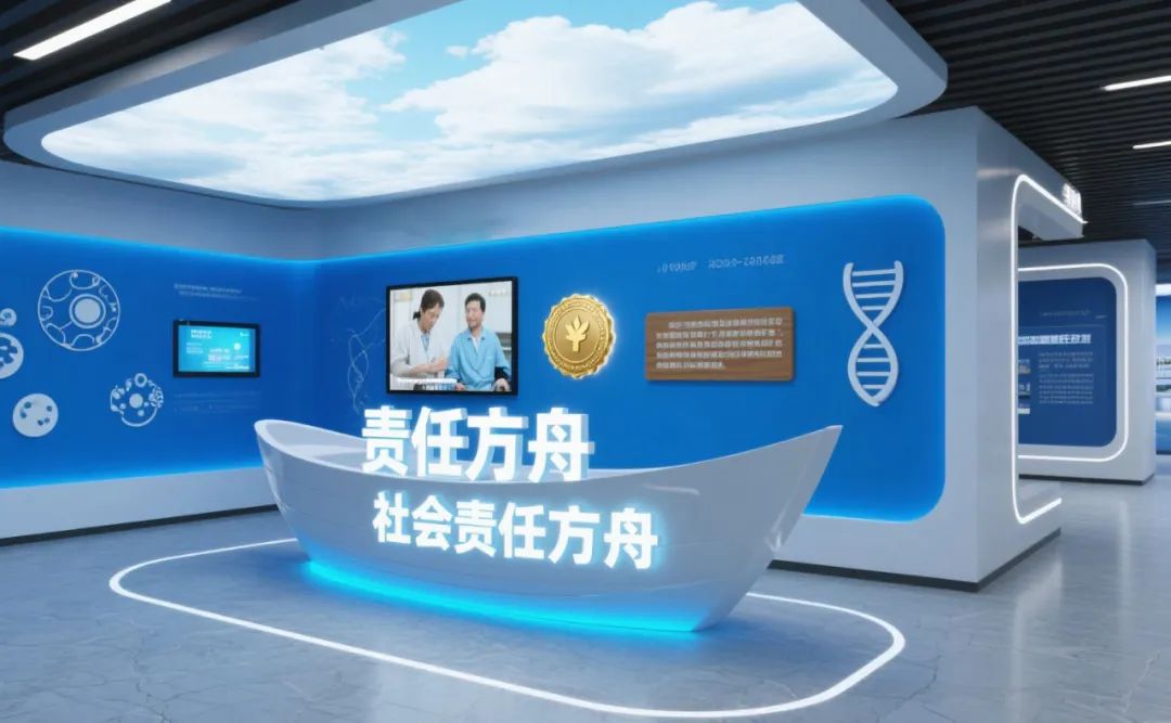 木纹生态墙嵌触控屏, " 干细胞银行交互台 " 实时查询全球细胞库储量。患者故事墙播放治疗影像日记,碳足迹监测屏展示绿色工艺减排成果。船舵造型托起的 " 责任方舟 " 标题,诠释科技向善的使命。