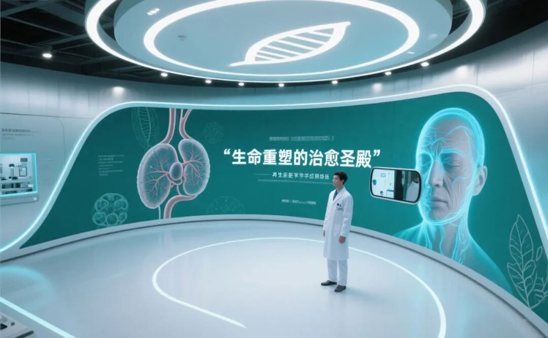 曲面墙投影器官修复案例,医疗白地坪强化洁净感。 " 抗衰互动镜 " 扫描人脸后,手势操控蓝色光流抚平数字皱纹; "VR 手术舱 " 沉浸式模拟帕金森干细胞治疗。墙面发光器官浮雕环绕 " 再生医学 " 标题,凸显科技造福人类的温度。