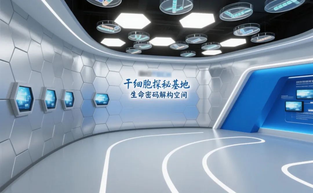 六边形蜂巢墙面嵌触控知识屏,顶棚模拟培养皿光环境。 6 组 AR 显微镜交互台实时展示神经干细胞分化过程, 50 万倍放大 3D 打印模型(可降解 PLA 材质)揭示细胞精细结构。此展区是 展馆设计 中将抽象科学具象化的典范。