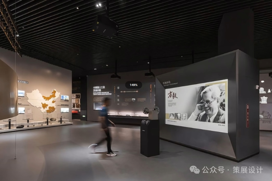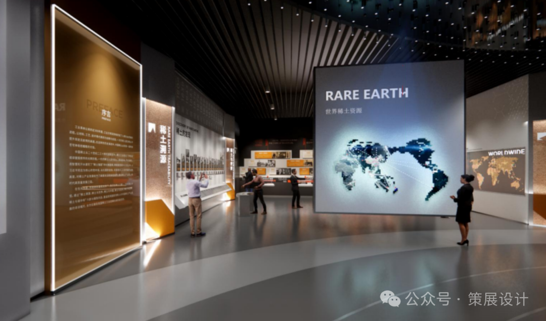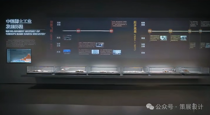 则展示了中国稀土产业发展的辉煌历程。这里通过战略定位对稀土产业发展的重要论述,展示了中国稀土产业发展过程中具有重要意义的政策文件。一幅巨大的中国地图上标注着中国四大稀土矿区的情况,相关的稀土矿石也在这里展出。稀土元素的应用科普以及四大矿区的不同开采方式科普让观众对中国稀土产业有了更加深入的了解。