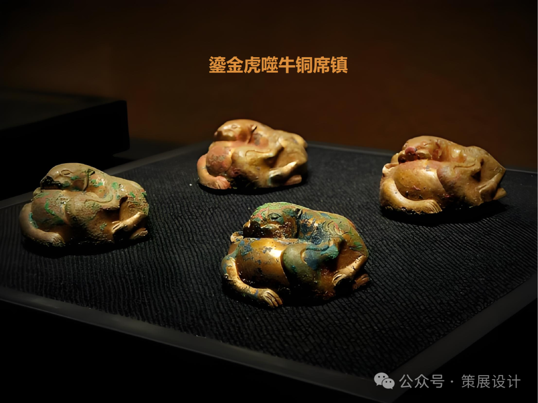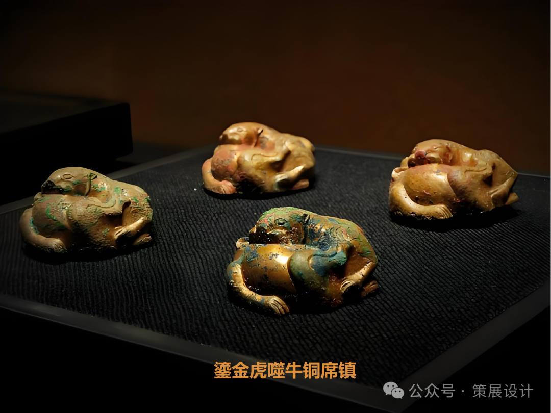 展厅中,一组精美的汉代 青铜器尤为引人注目。虎噬牛鎏金铜镇、柿蒂纹四棱铜钫等青铜器造型独特、工艺精湛,充分展示了汉代晋阳人优渥的生活水平和优雅的审美情趣。这些青铜器不仅是汉代晋阳城经济繁荣的象征,更是中华文明瑰宝中的璀璨明珠。