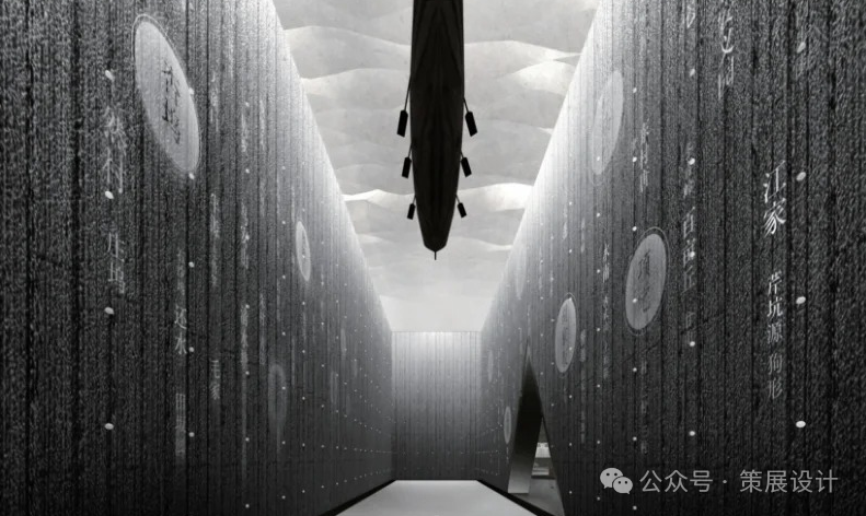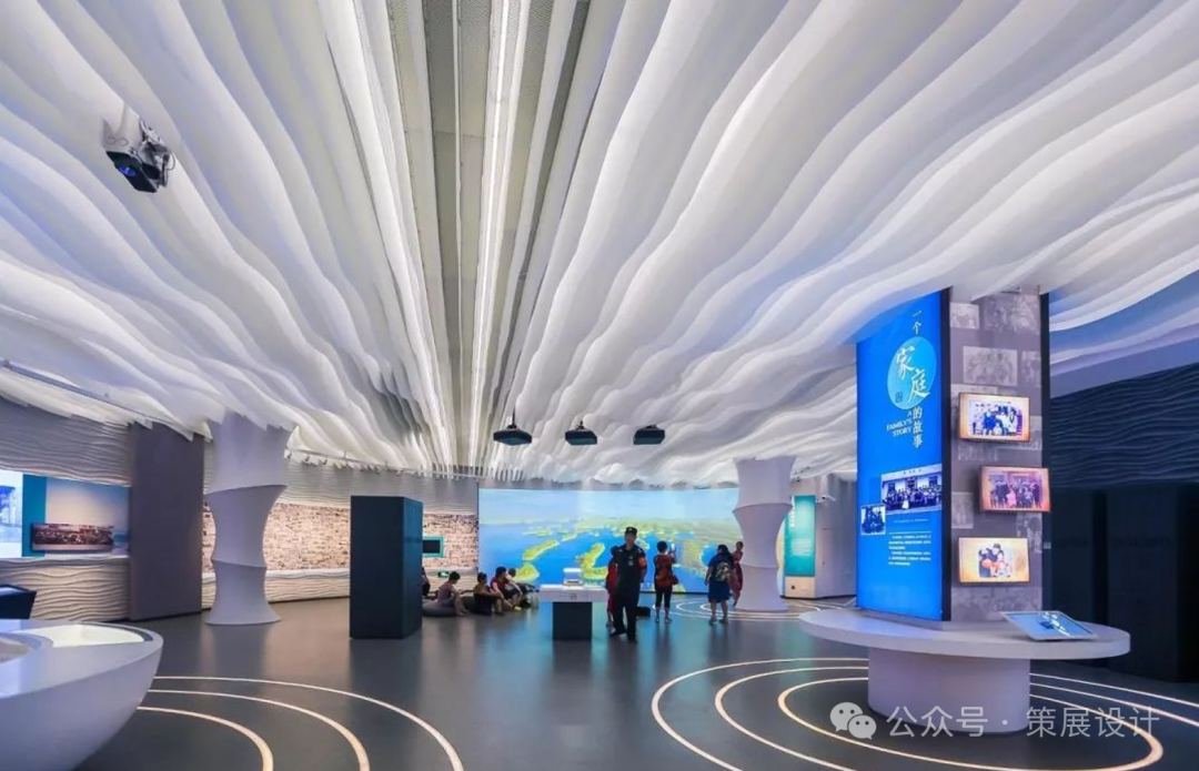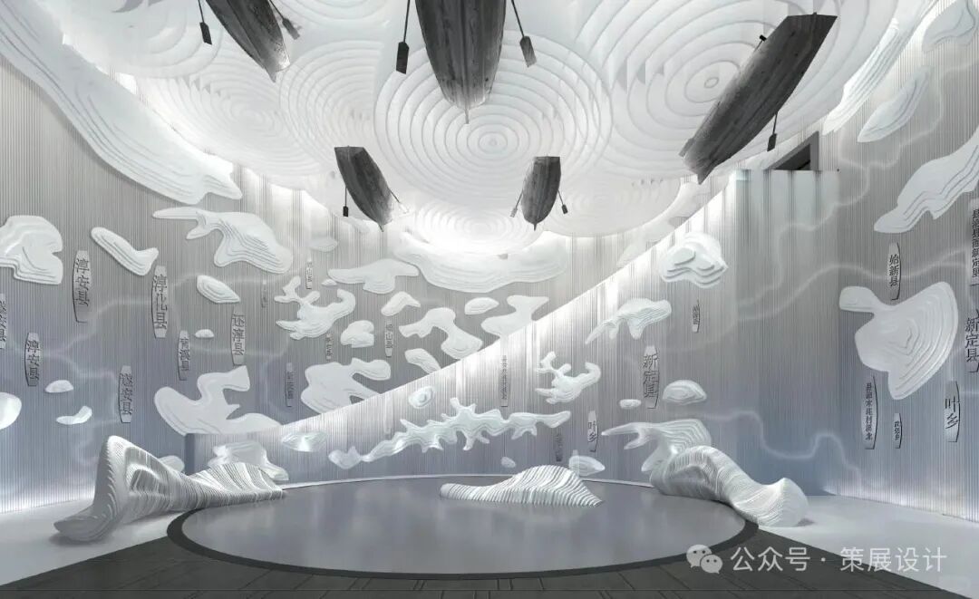 步入淳安博物馆的序厅,一股浓厚的历史气息扑面而来。顶部,一个由30多万片贝壳组成的艺术装置蔚为壮观,它们仿佛诉说着淳安与水的深厚渊源,波光粼粼,让人仿佛置身于水下世界。几艘悬挂的木船悬于空中,轻轻摇曳,营造出一种置身水底的空间感,让人不由自主地想起淳安那片碧波荡漾的千岛湖。四周墙面的块状起伏装置,则代表着淳安曾经的山,现在的岛,它们起伏跌宕,如同历史的波澜,诉说着这片土地的沧桑巨变。