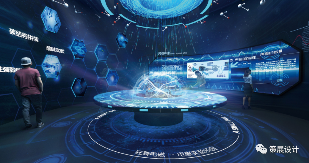 移步向前,以多点互动桌面与小实验为载体,展示灵动声律(声音的产生、声音的传播、回声、声音的特性、 声音的趣味实验)、狂舞电磁(摩擦起电、静电、磁现象、电磁感应、有趣的电磁实验)、化学天地(酸碱实验 碳结构拼装),解密大自然神奇现象。