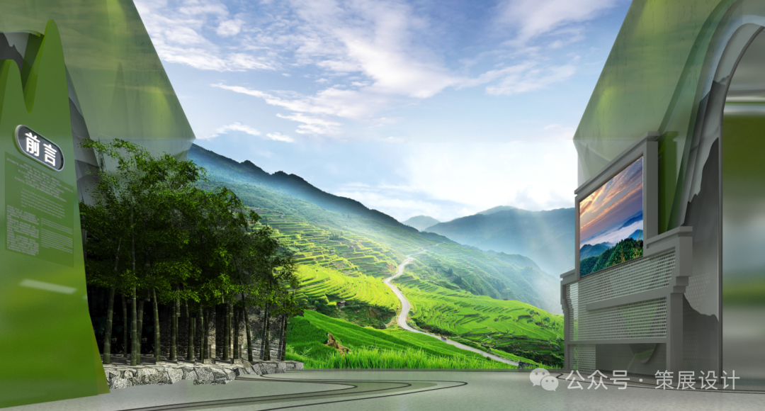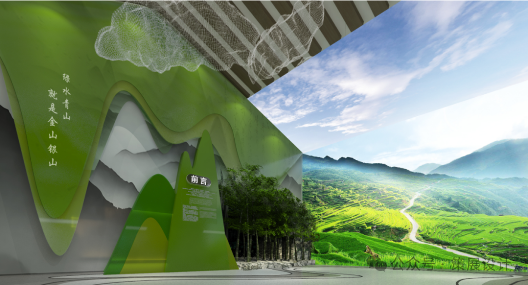 以安吉人居环境为蓝本,使展厅开篇就定下浓浓的安吉特色。两侧展墙纱幕支撑出山的倒影形态。运用墙体彩绘图、纱幕、光电灯膜、动态投影灯、定向声效、丝网云朵等展示手段,打造出美轮美奂的绿水青山氛围的序厅,体现美好家园的珍贵,为后续参观内容做铺垫、做心理建设。