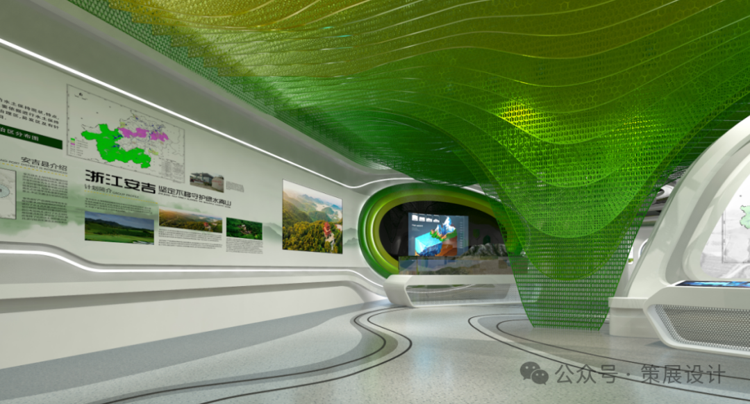 取材安吉元素,以山峦的曲线为灵感,运用金属冲孔板组合出抽象造型,如山的倒影蜿蜒呈现在展厅顶部,冲孔板的通透和张力,营造震撼的效果,艺术的表现瞬间升华展厅的主题定位。所有展台、展墙外框形态都规避尖锐棱角,体现水的柔性质感,与吊顶共同组成山谷、梯田、绿洲的中国山水画卷,参观者在展厅犹如在桃花源行进游览。