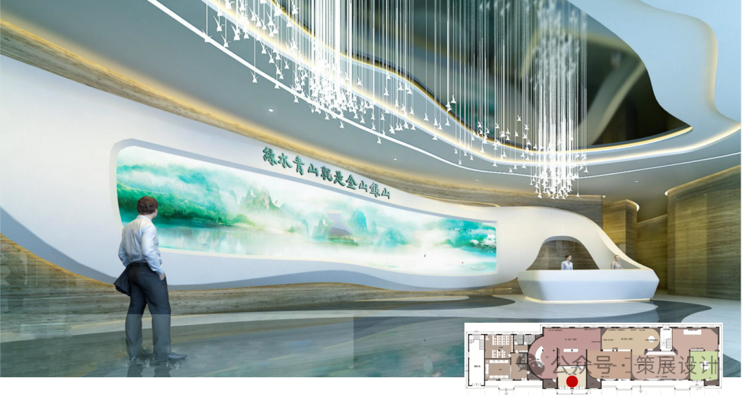 以象征开化县山水资源的灵动优美曲线来营造开阔的前厅(过厅)空间,巨幅油画全面展示开县生态之美,同时前厅(过厅)同时兼顾接待与休息功能