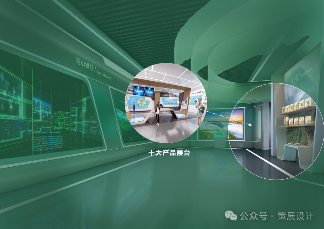 两山展示馆在功能布局上每一板块区分明确,以大开大合的空间结构进行设计,每一板块有区分有结合,整个空间使用飘带相连与展示逻辑“两山萌发、两山蓄势、两山勃发、两山成果、未来展望”完美结合,在物理层面上形成一条指引参观动线,在意识层面是开化县两山实践的发展史。