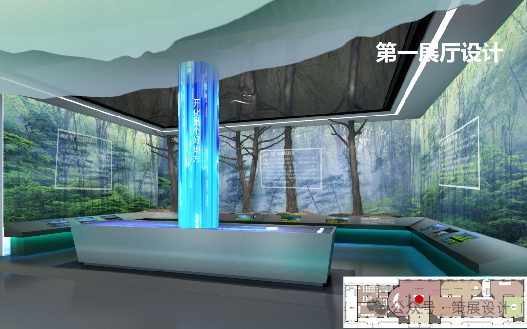 厅以VCR投影视频结合开化县全域电子LED沙盘宣传开化县地理位置、两山发源、生态美好等优势 ,与LED软膜屏包柱及开化县特有的钱江源水文化元素飘带设计形成一幅开化县特有的生态画面,使步入展厅的参观者一下子就融入开化县美丽的生态环境中。