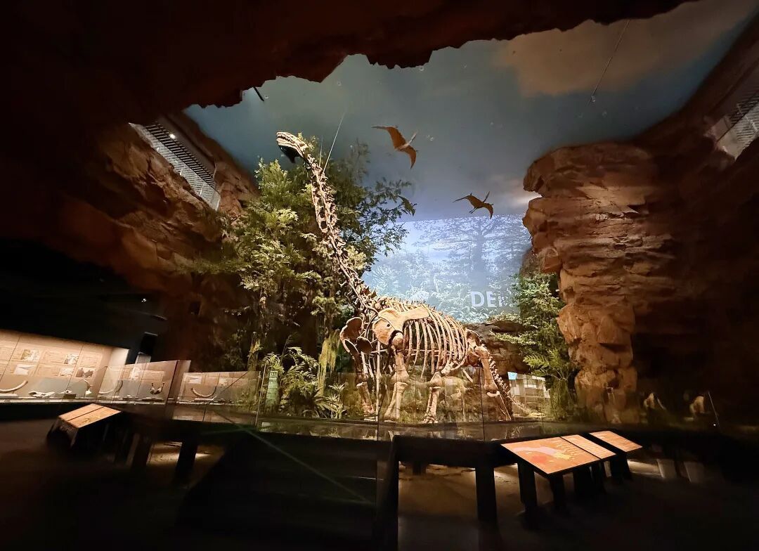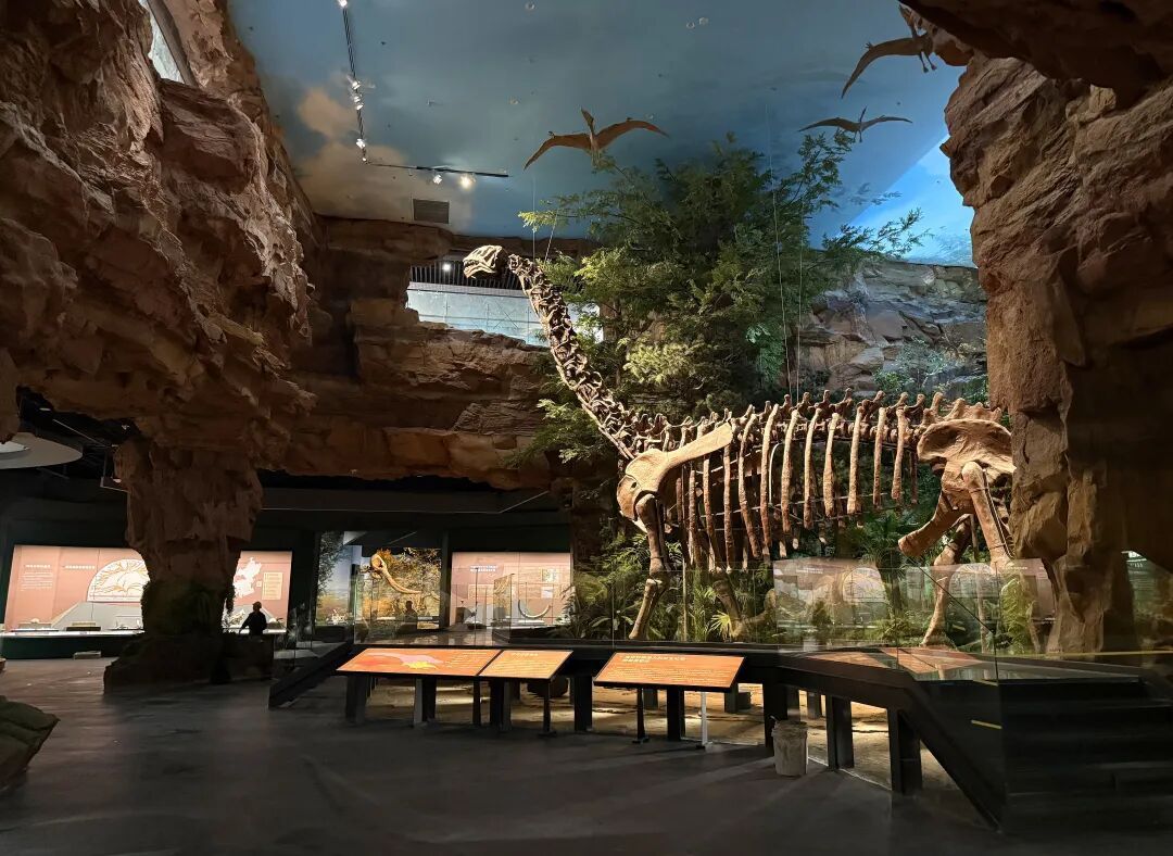 这具26米长的查干诺尔龙骨架如山脉般横亘眼前,骨骼的沟壑间仿佛还残留着白垩纪阳光的温度,瞬间攫住所有目光 —— 这头 “亚洲白垩纪最大恐龙” 的肋骨弧度里,似乎仍回荡着它漫步湖畔时的沉重足音。