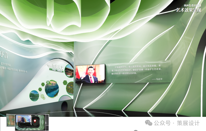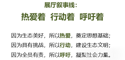 右侧以立体字和平面的方式呈现习近平对于生态建设的最高指示。序言部分交代展厅建设的项目背景、展示特色、内容分布以及重大意义等内容,让参观者了解展厅的总体情况。