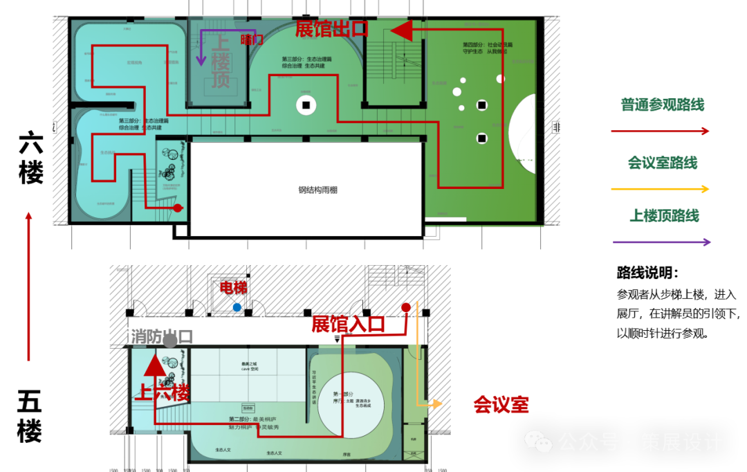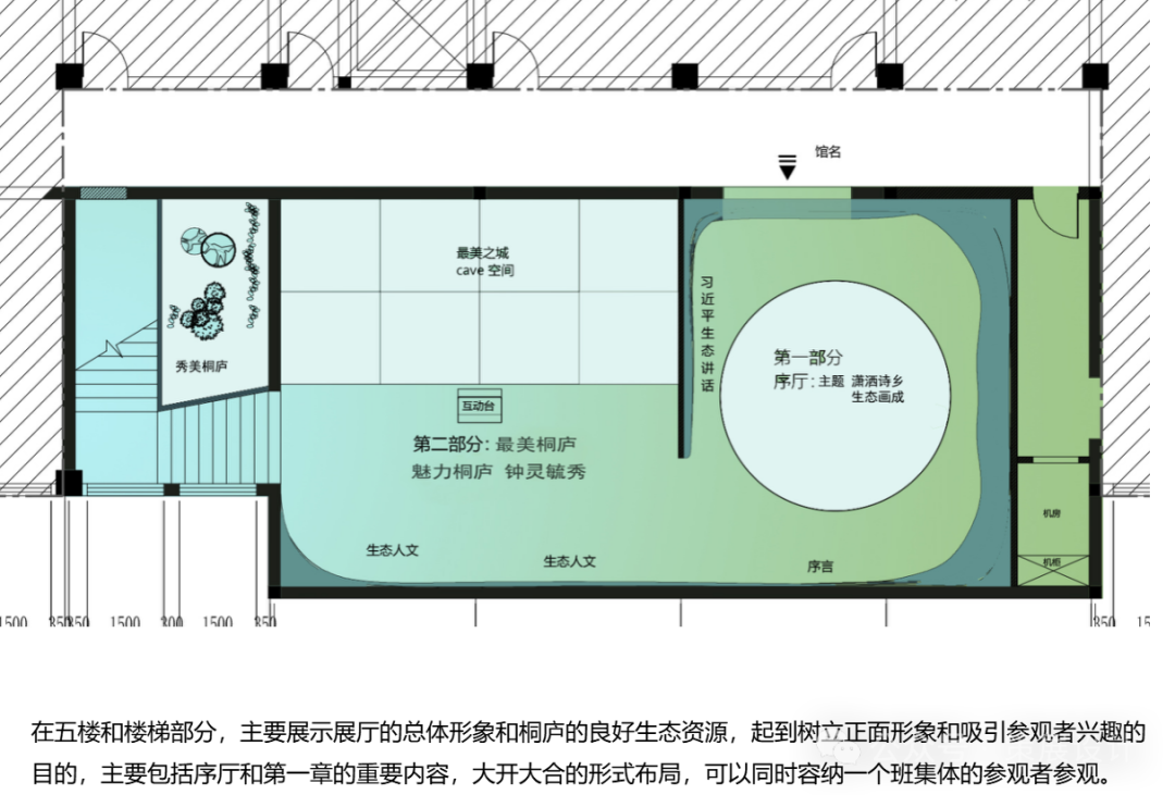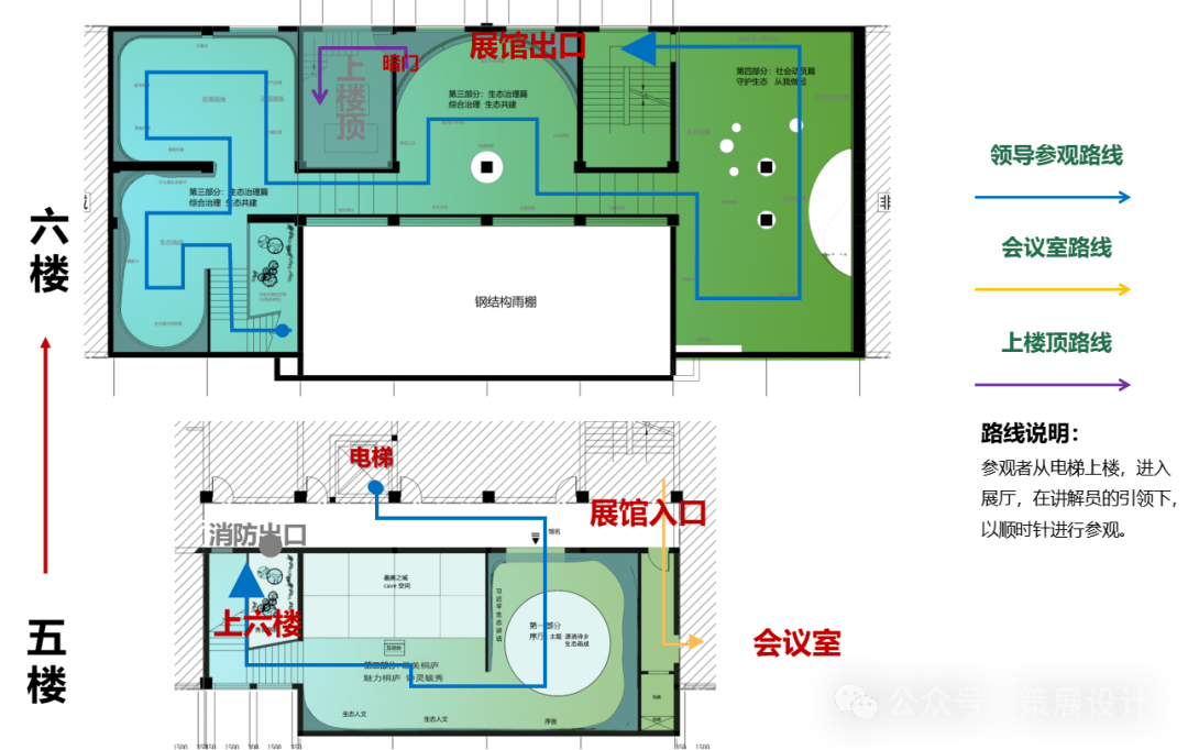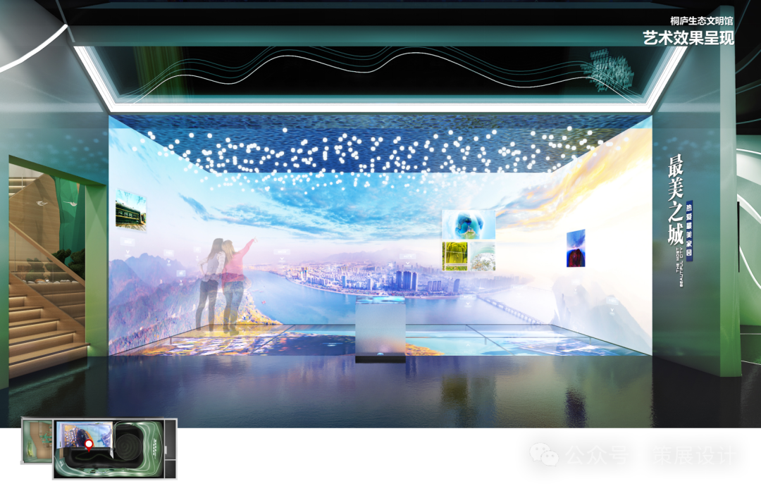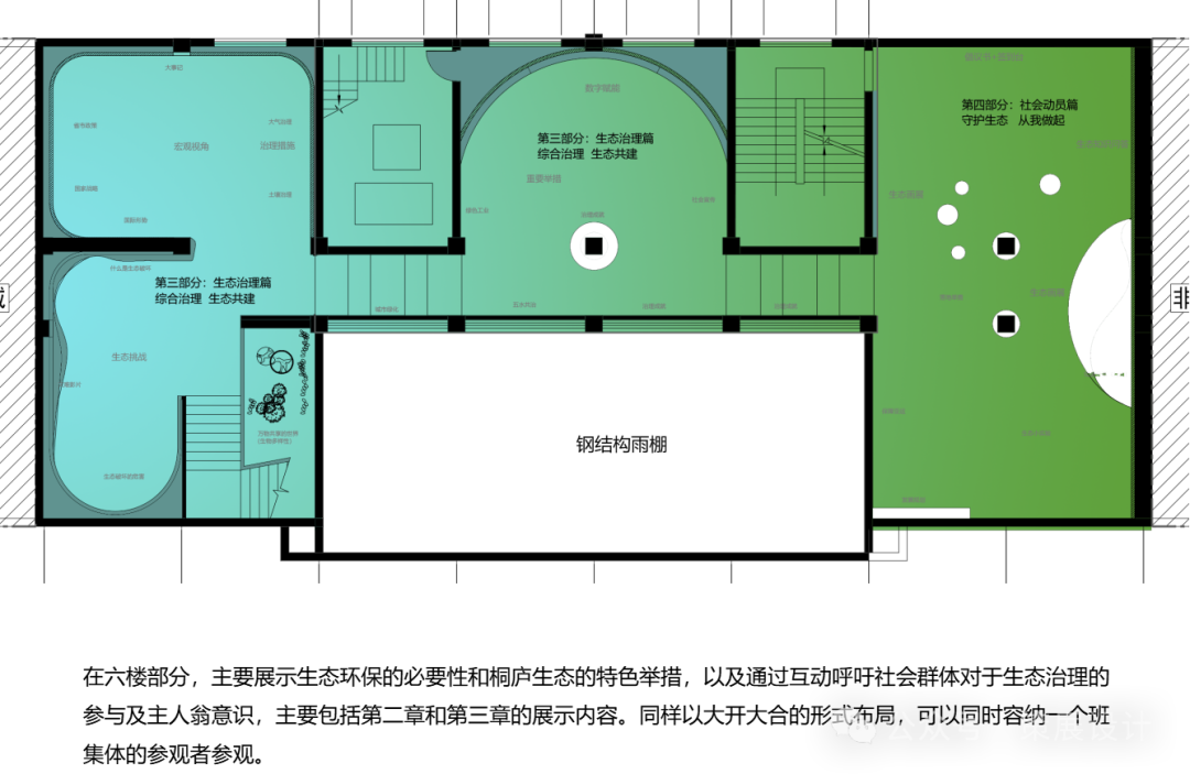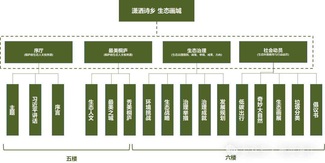 整体布局包括五楼和六楼桐庐生态文明馆,以及四楼到顶楼的楼梯通道的展陈设计与安装。