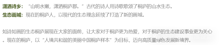 桐庐将高水平推进生态文明建设,勇担建设“重 要窗口"新使命,拓宽“两山"转化路径、着力推动绿色崛起,奋力展现“重要窗口"的桐庐风釆