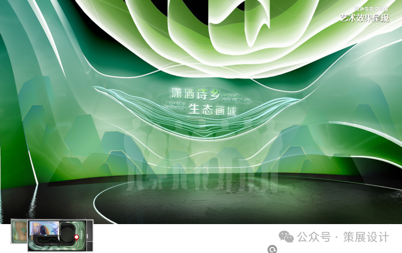 展厅的主题墙,采用青山绿水古代诗画的形式进行体现,中间为展厅的主题:潇洒诗乡,生态画城,顶部为绿色的飘带,代表着发扬与传承,地面为桐庐生态地图以及引导线。