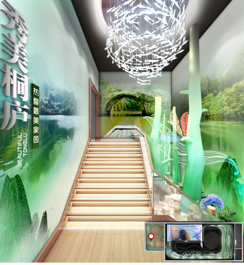 在五楼到六楼的楼梯间,展现秀美桐庐的主要内容,是对于桐庐优美生态的内容拓展。楼梯配置安全护栏,楼梯的着力点都在梁柱之上,保证受力。楼梯右侧,设置树干造型,顶部设置鱼群模型,墙壁为生态巨幅油画,给参观者十足的生态体验感。