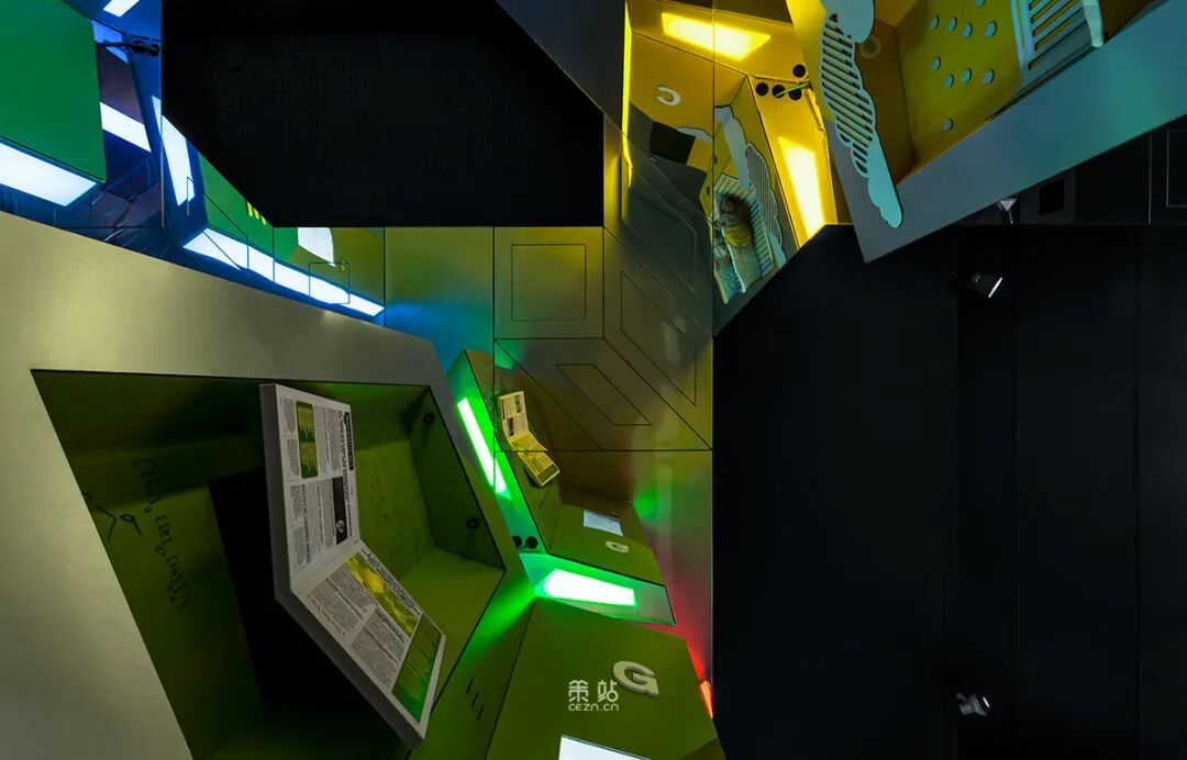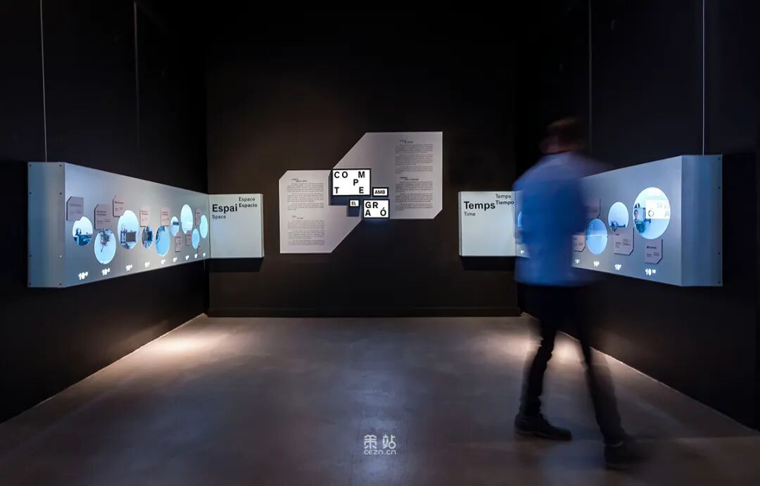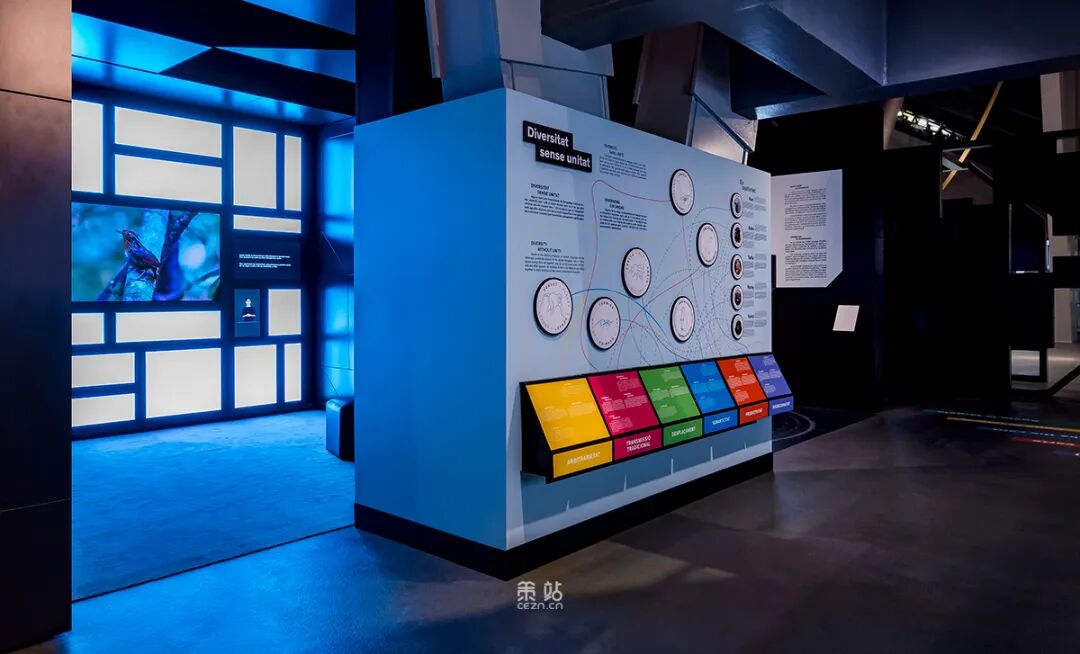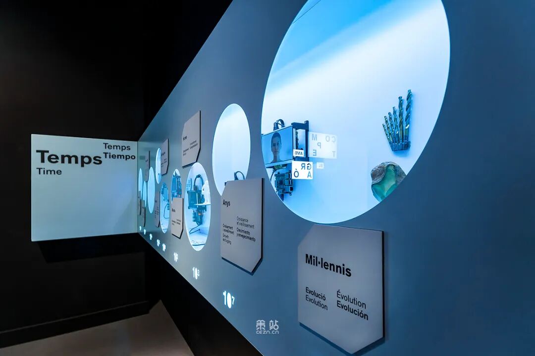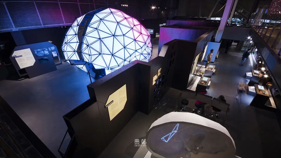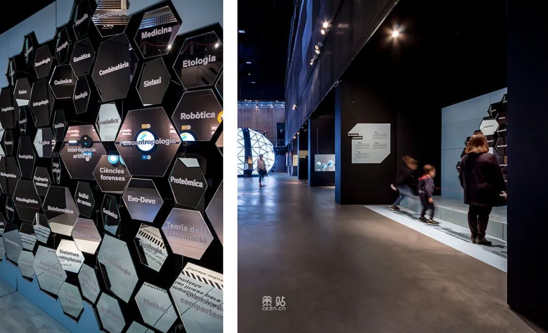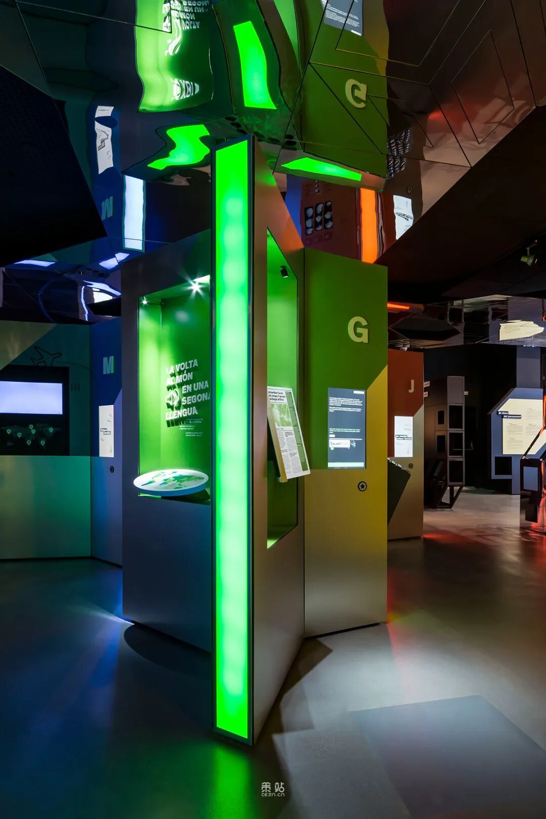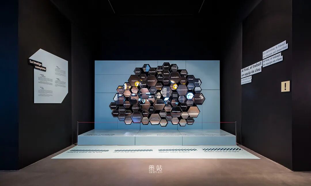 CosmoCaixa 专用区域为750 平方米,有三个墙边界,第四面是与博物馆其他部分的连接点。因此,这是入口和出口所在的位置。所有的展览围墙和分隔墙都遵循相同的构造系统:不同形状和尺寸的折叠铝板模块连接起来形成一个几何表面。