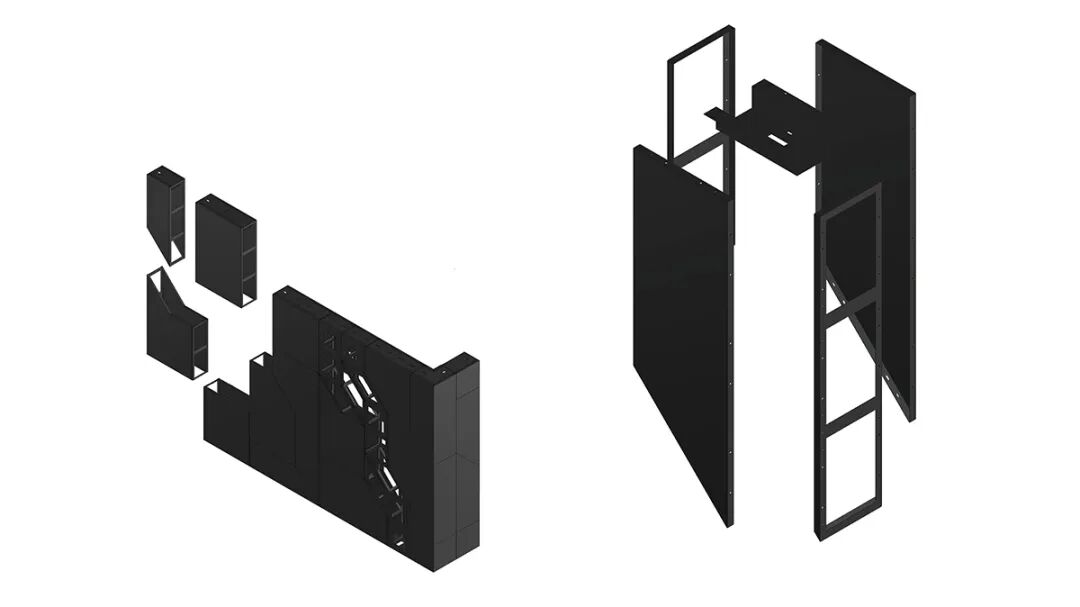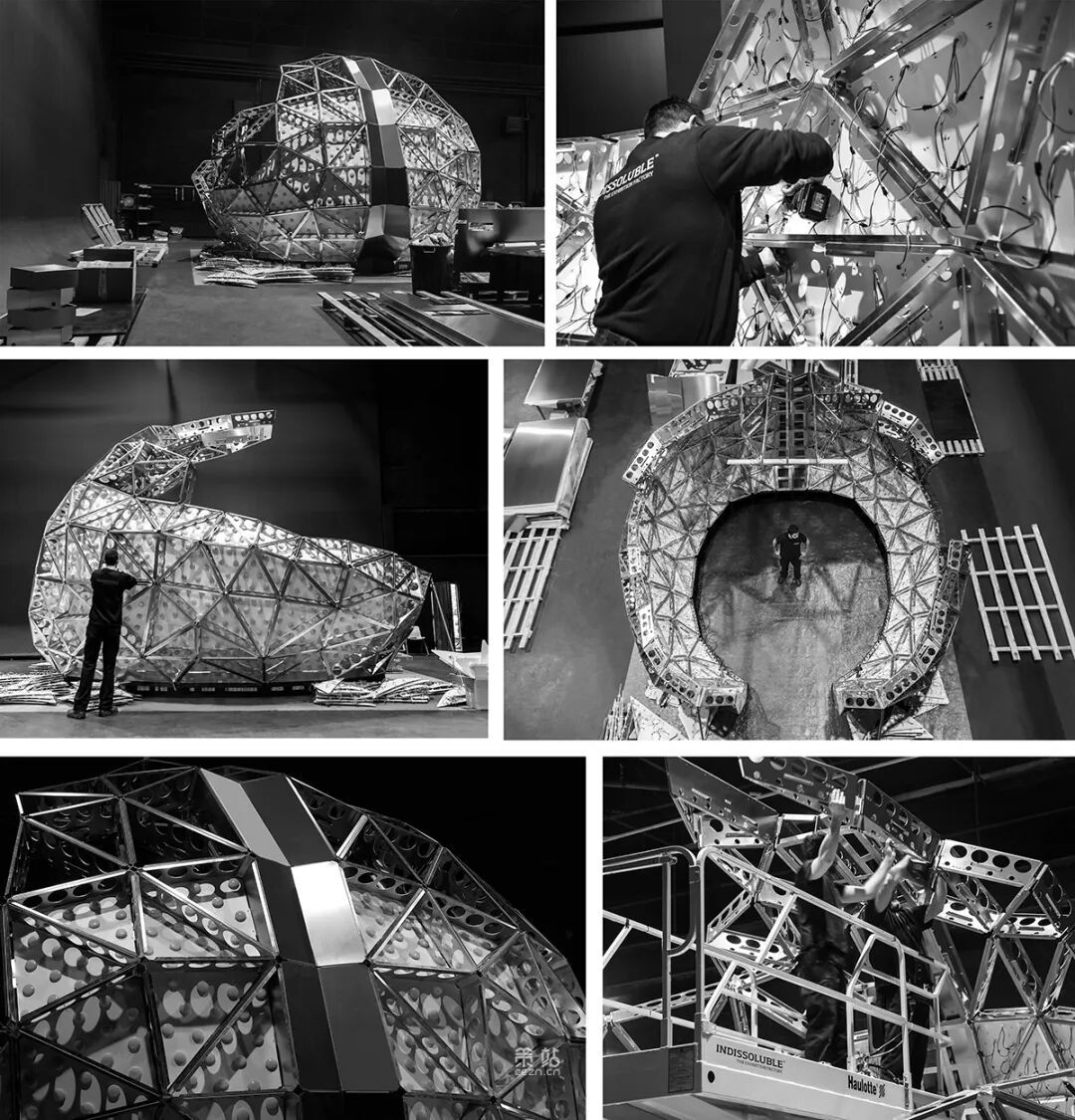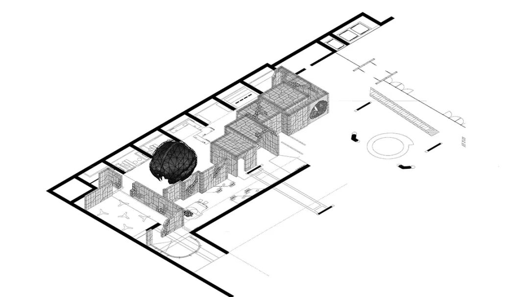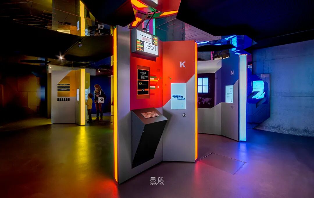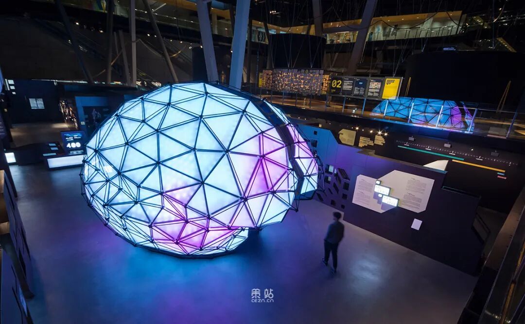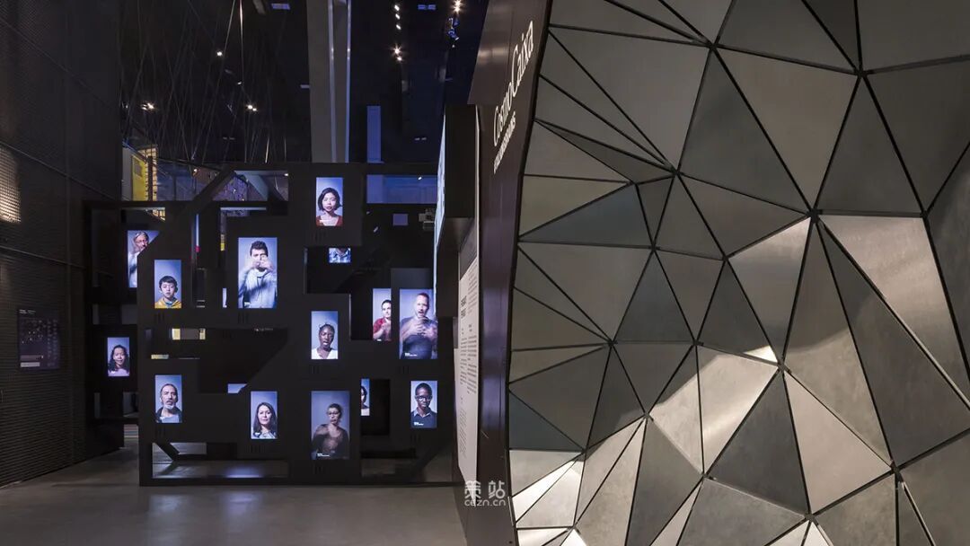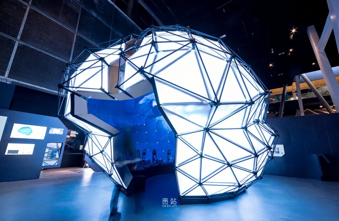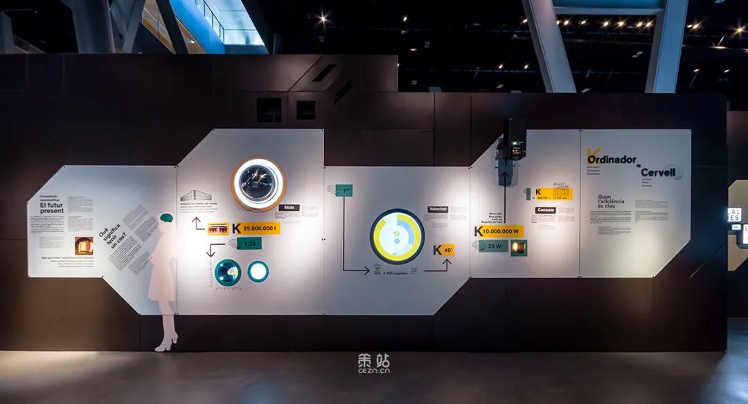 CosmoCaixa 专用区域为750 平方米,有三个墙边界,第四面是与博物馆其他部分的连接点。因此,这是入口和出口所在的位置。所有的展览围墙和分隔墙都遵循相同的构造系统:不同形状和尺寸的折叠铝板模块连接起来形成一个几何表面。